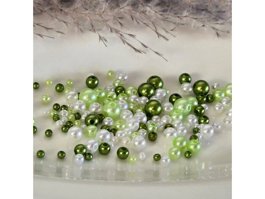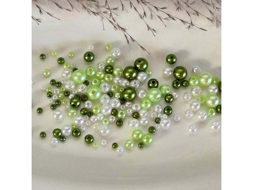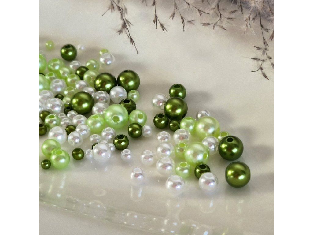 Jemný a svěží mix perličkových korálků v odstínech bílé, světle zelené a sytě zelené. Perleťový lesk dodává luxusní vzhled, zatímco lehký ABS plast zajišťuje pohodlné použití při každodenním tvoření.