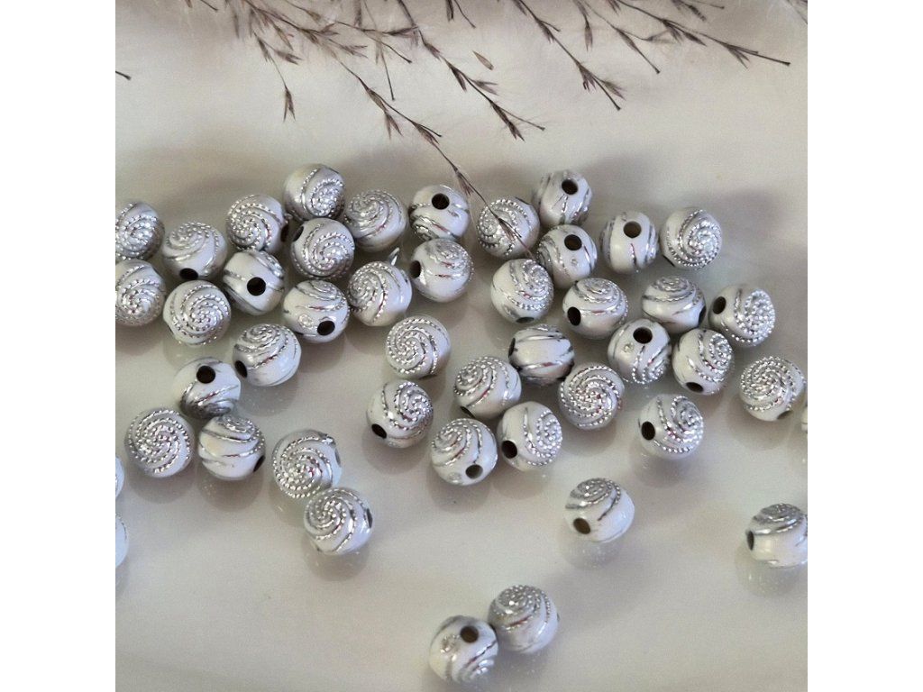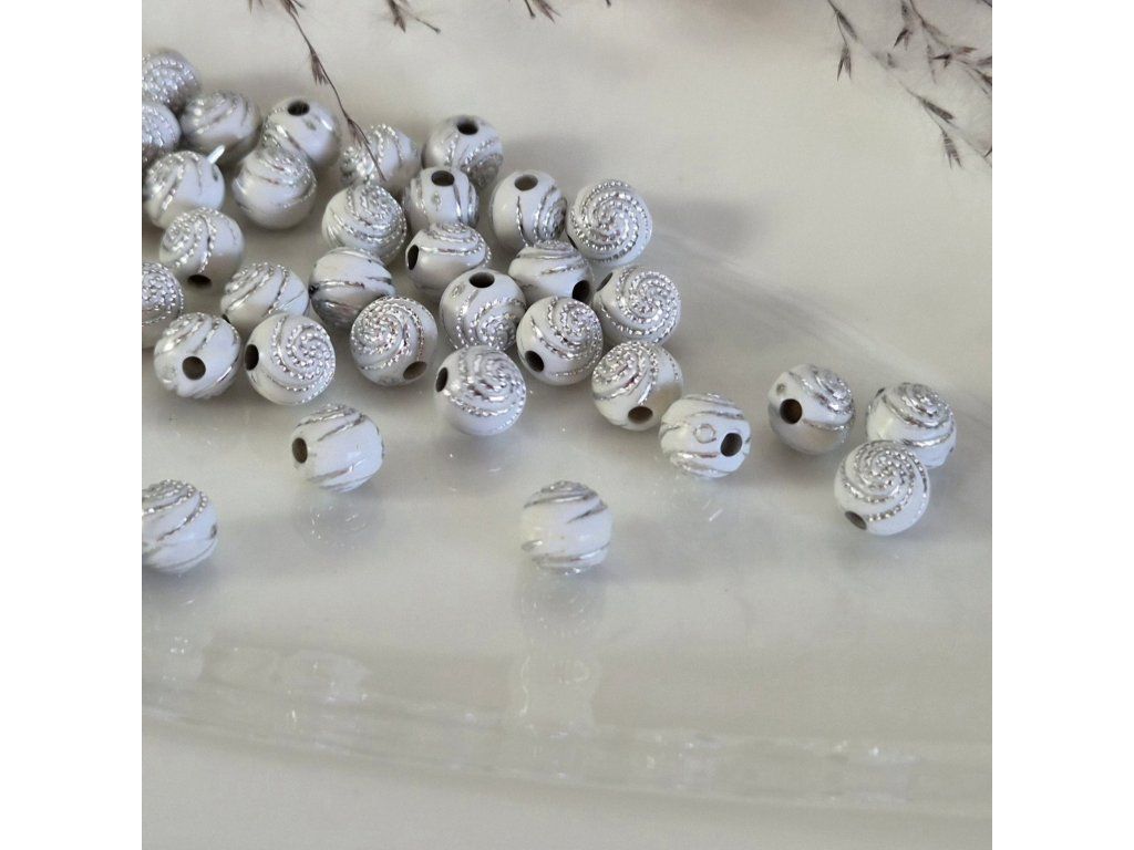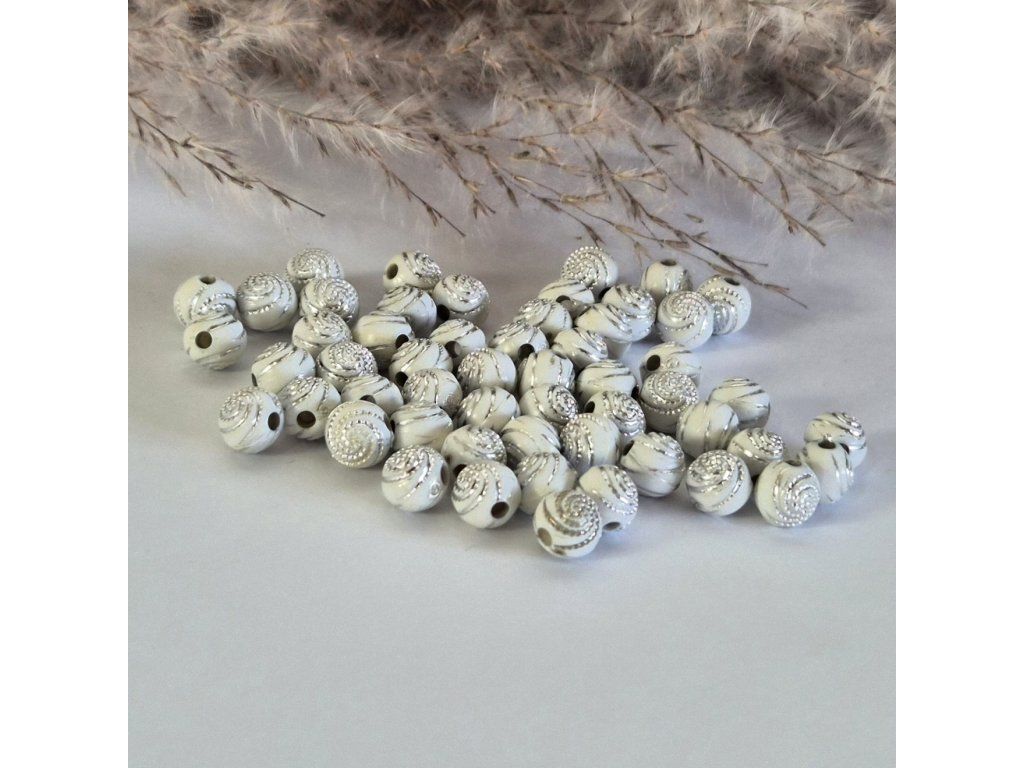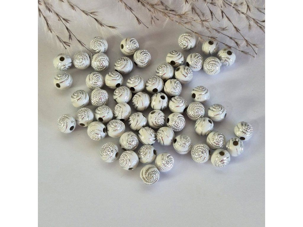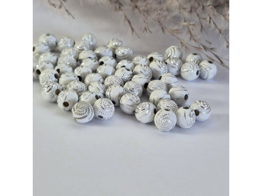 Stylové akrylové korálky v bílé barvě s jemným plastickým spirálovým vzorem a lehkou patinou, která zvýrazňuje detaily. Působí elegantně, lehce vintage a velmi dekorativně.