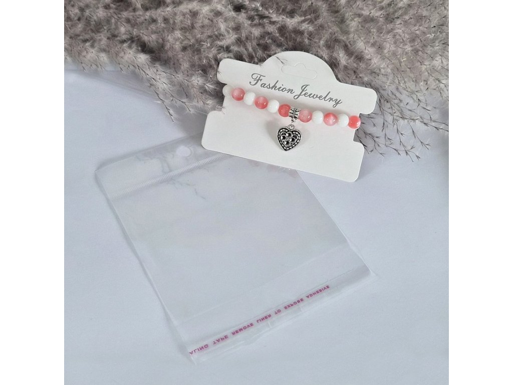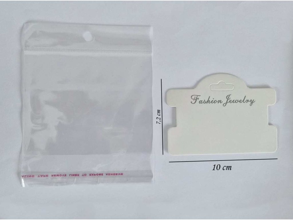 Součástí je pevná bílá karta s nápisem „Fashion Jewelry“, která umožňuje snadné uchycení náramku či náhrdelníku. Sáček je opatřen lepicí chlopní pro jednoduché a bezpečné uzavření.