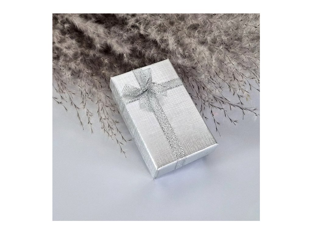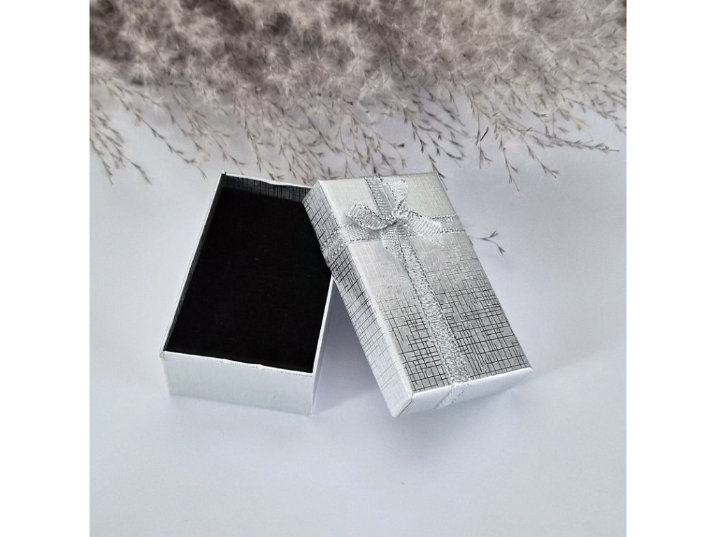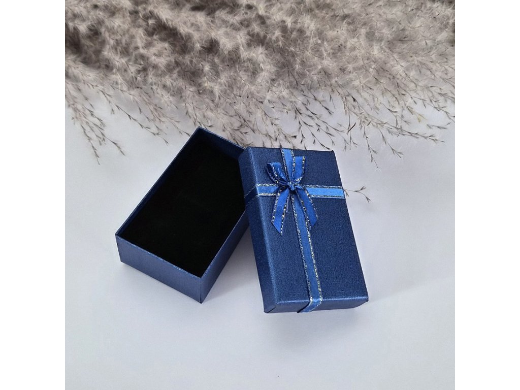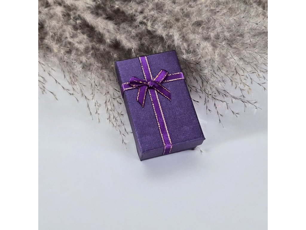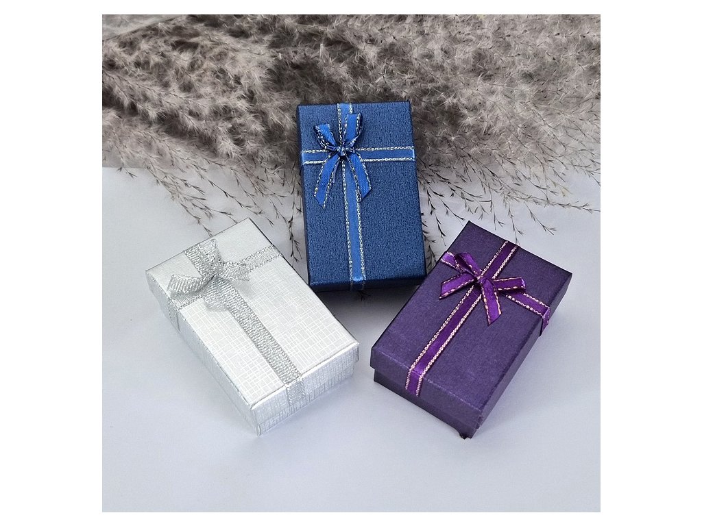 Elegantní dárková krabička s ozdobnou stuhou a mašlí, vhodná pro stylové balení šperků a drobných dárků. Krabičky jsou dostupné v několika barevných variantách (např. modrá, fialová, stříbrná) a působí slavnostním a luxusním dojmem.