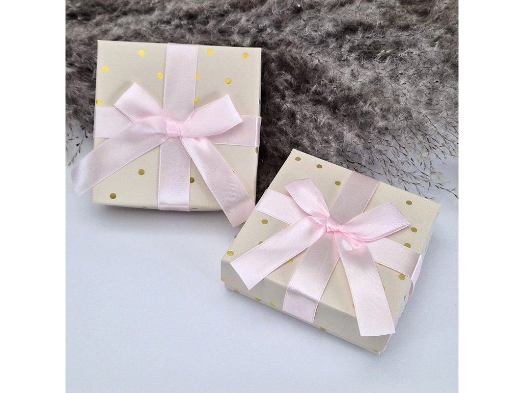 Elegantní dárková krabička o rozměru 10 × 10 × 3 cm je ideální volbou pro stylové balení šperků i drobných dárků. Jemný růžový základ doplňují decentní zlaté puntíky, které krabičce dodávají slavnostní a luxusní vzhled. Celkový dojem podtrhuje saténová světle růžová stuha uvázaná do mašle.