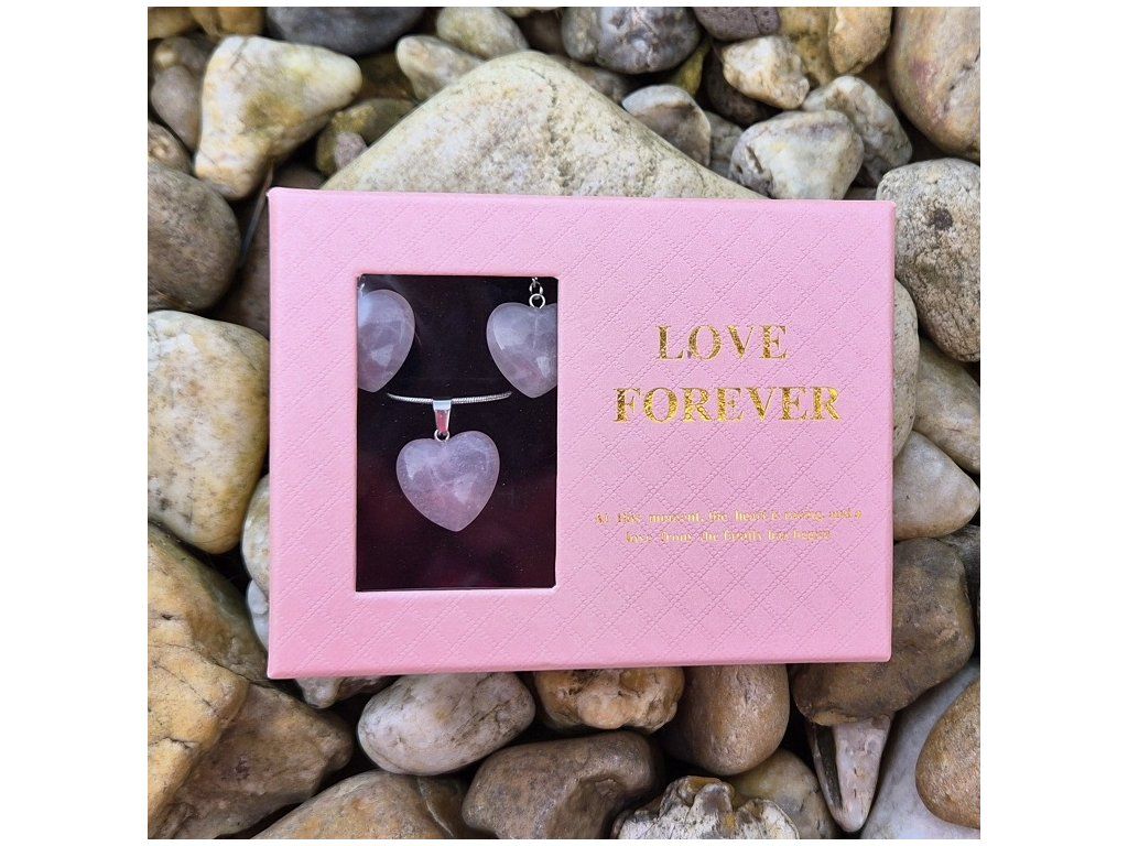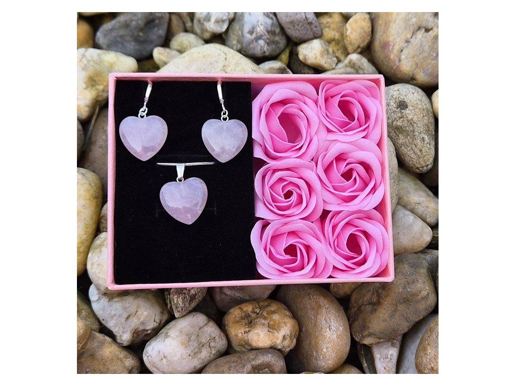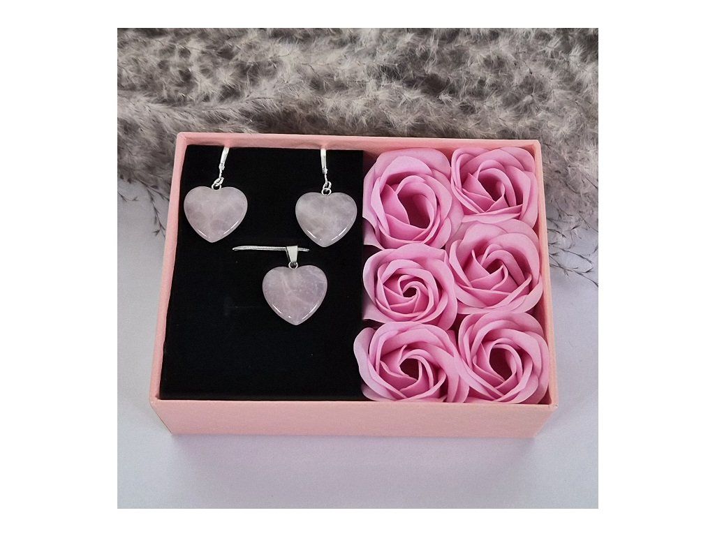 Romantický dárkový set tvořený náušnicemi a přívěskem ve tvaru srdce z přírodního růženínu, uložený v elegantní dárkové krabičce s dekorativními růžemi. Tento set je ideální volbou jako dárek z lásky, k výročí, narozeninám nebo výjimečné příležitosti.