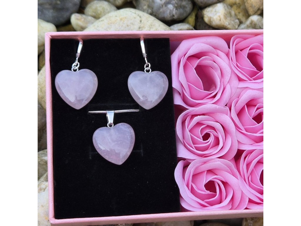 Dominantou setu jsou jemně broušená srdce z přírodního růženínu v něžném světle růžovém odstínu. Růženín se vyznačuje typickou mléčně průsvitnou strukturou a přirozenou kresbou, díky níž je každý kus originál.