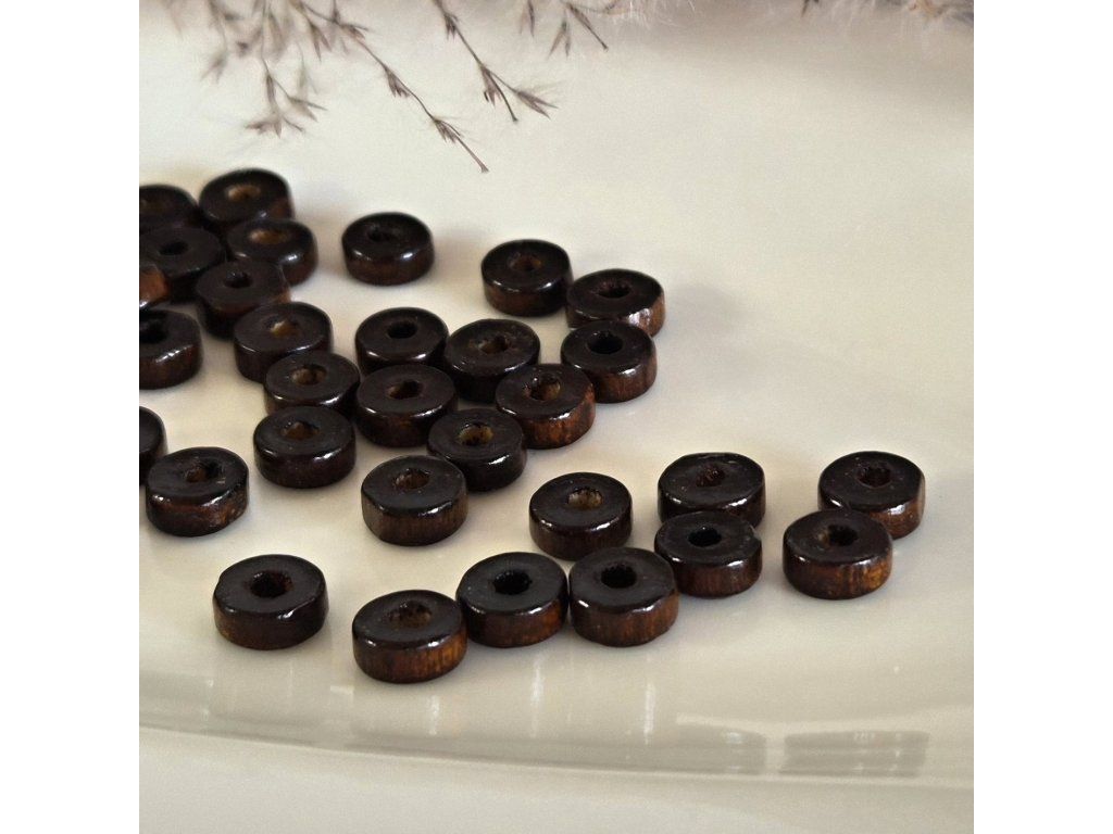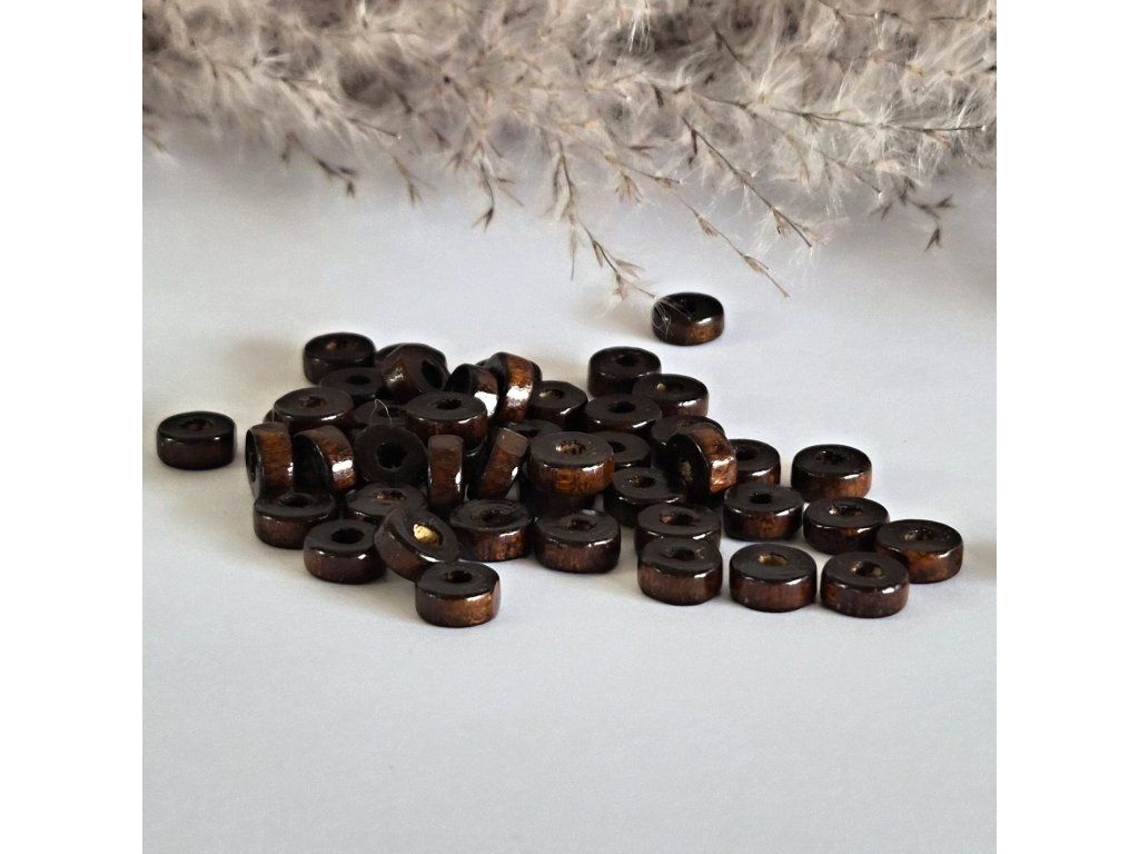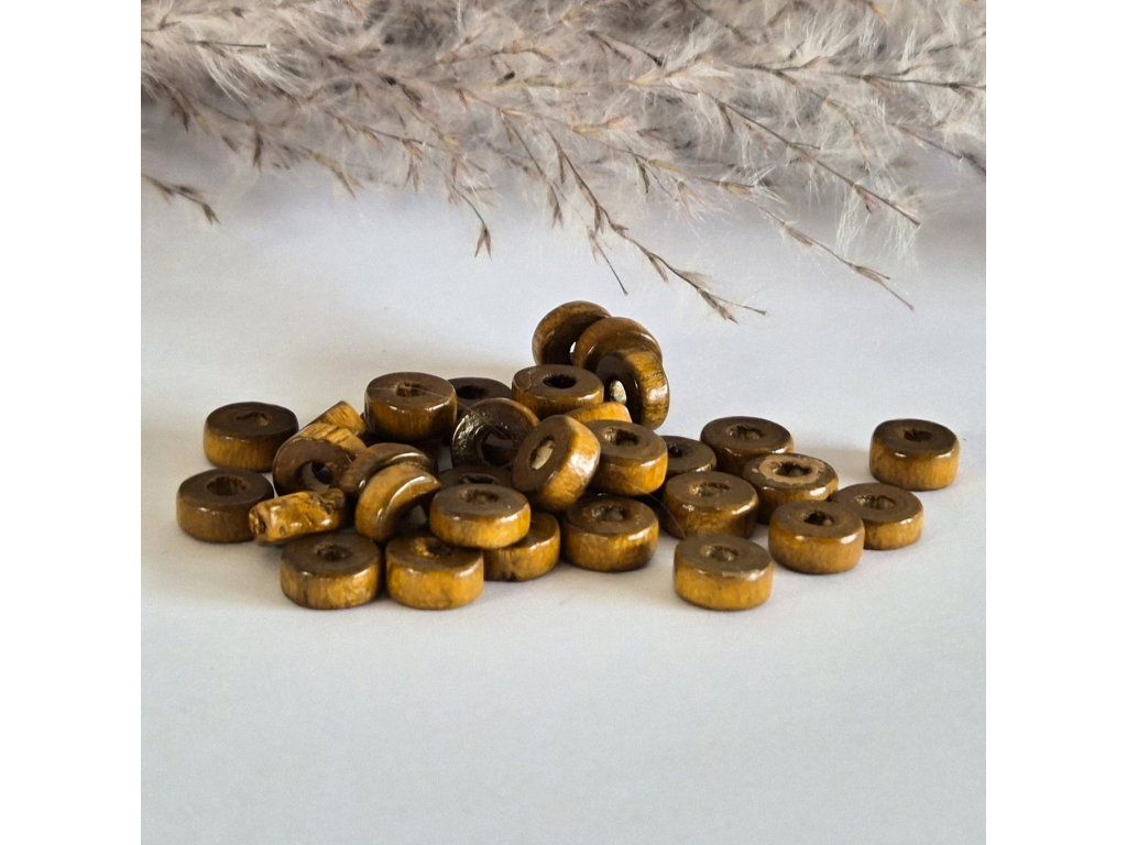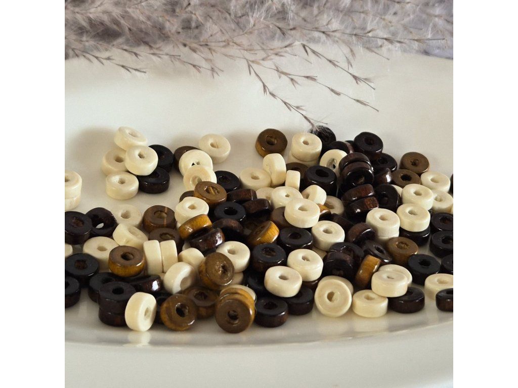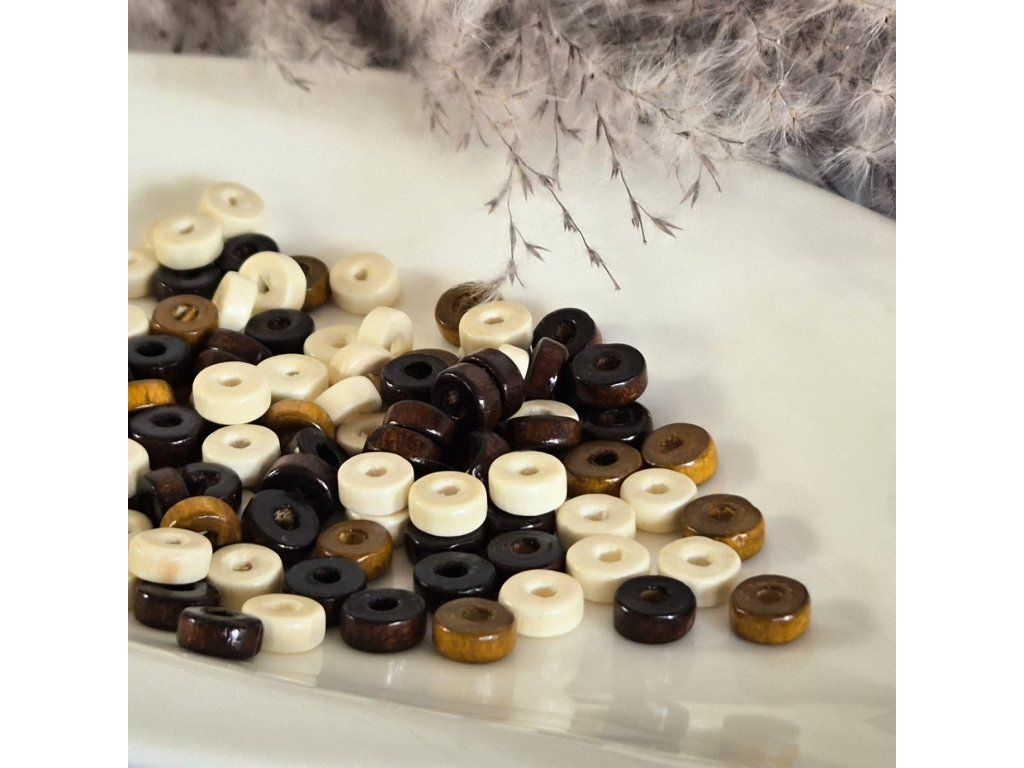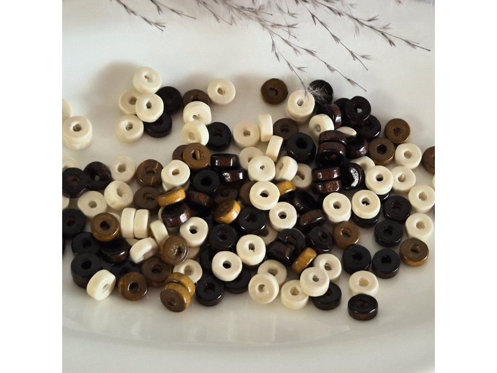 Přírodní dřevěné korálky v harmonické kombinaci světlých, hnědých a tmavých odstínů. Jejich jednoduchý diskový tvar a matně-lesklý povrch vytváří přirozený boho vzhled, který působí teple, jemně a autenticky. Barevná variabilita dodává každému projektu originální charakter.