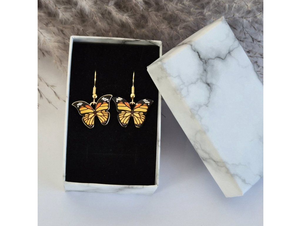 Stylové ručně vyráběné náušnice s krásnými motýlky v teplých odstínech oranžové, zlaté a černé barvy. Motýlci jsou smaltovaní, což jim dodává výrazné barvy, jemný lesk a detailní kresbu připomínající skutečná motýlí křídla.