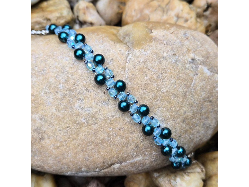 Kombinace tmavě tyrkysových perliček a světle modrých broušených korálků vytváří svěží a výrazný vzhled. Ideální pro milovnice chladných tónů a letních barev.