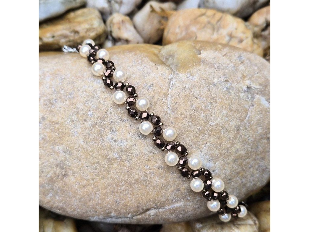 Teplé odstíny hnědé v kombinaci s jemnými krémovými perličkami vytváří nadčasový a sofistikovaný design. Vhodný pro elegantní i business styl.