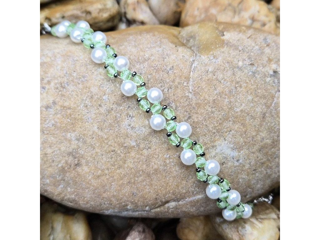 Jemně zelené broušené korálky v kontrastu s bílými perličkami působí lehce a přirozeně. Perfektní volba pro jarní a letní období.