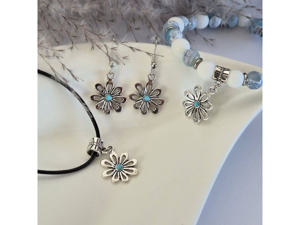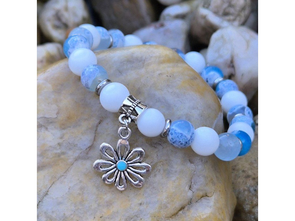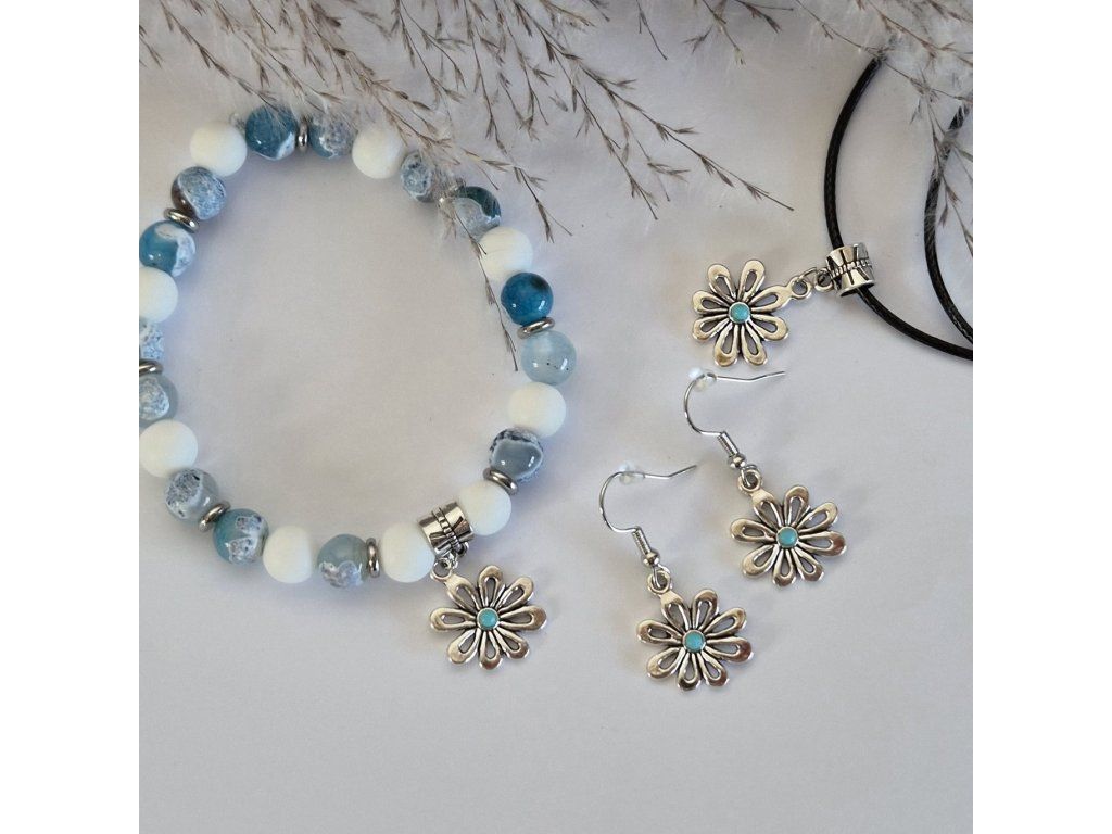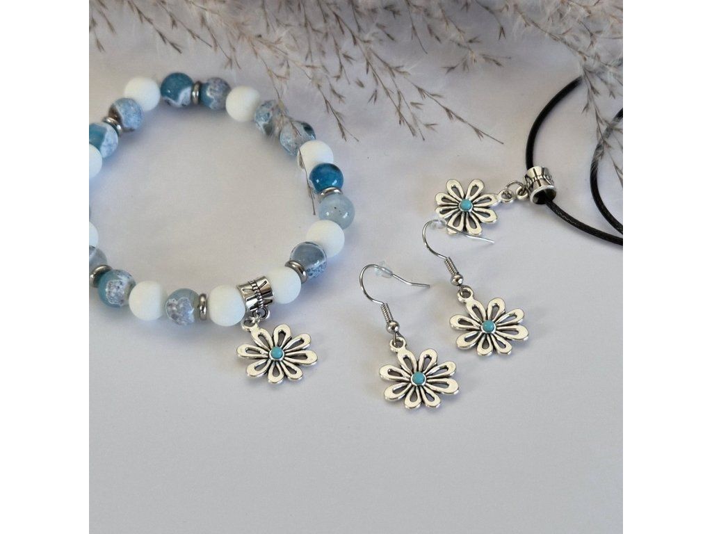 Náramek je doplněn dekorativním přívěskem ve tvaru květu, který ladí s náušnicemi i přívěskem náhrdelníku. Jemné modré detaily ve středu květu krásně doplňují odstíny korálků a dodávají šperku svěží vzhled.