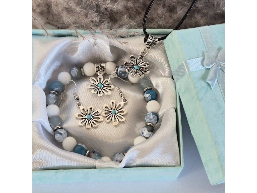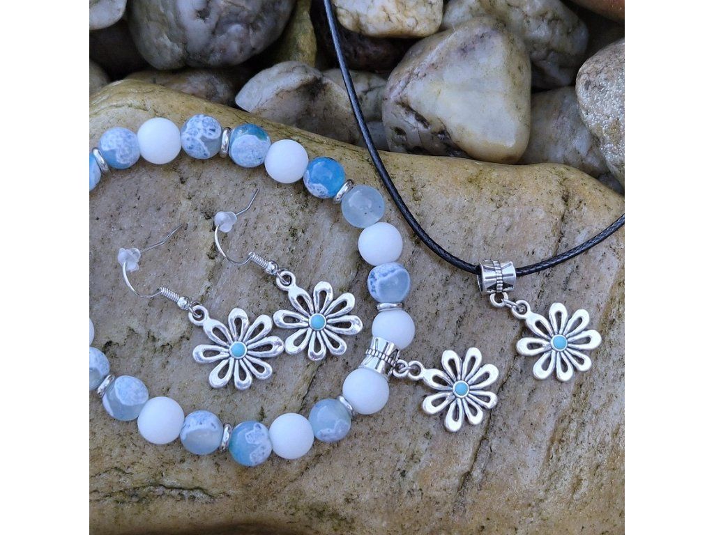 Originální ručně vyráběný šperkový set složený z náramku, náušnic a náhrdelníku v jemné kombinaci bílé, modré a stříbrné barvy. Harmonické spojení přírodních kamenných korálků, korálků z dračí žíly a onyxu vytváří elegantní a zároveň výrazný doplněk.