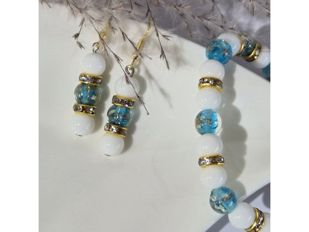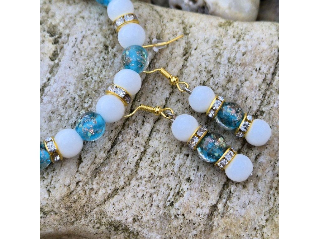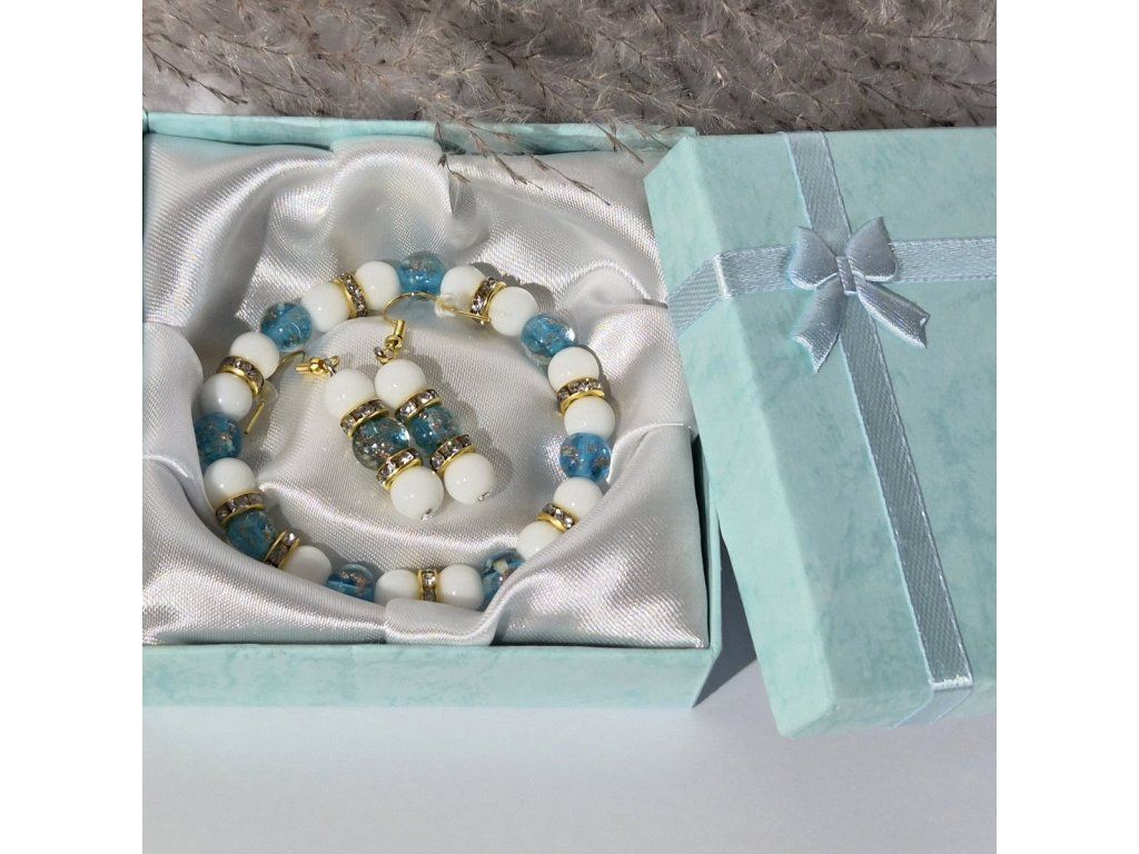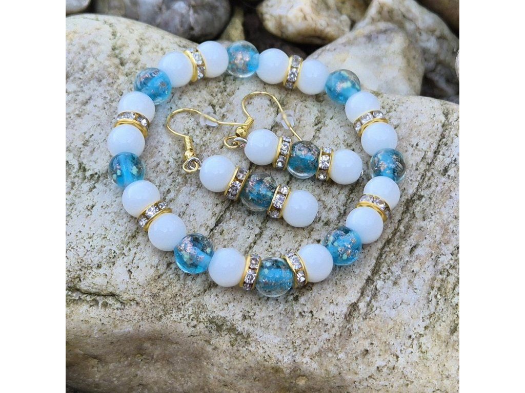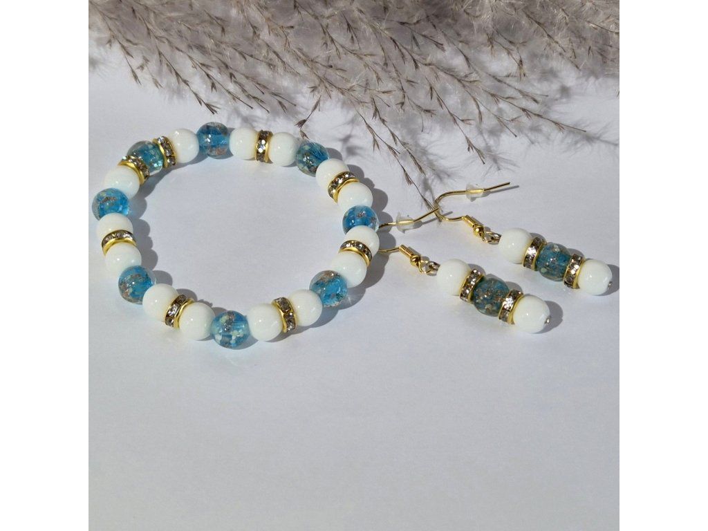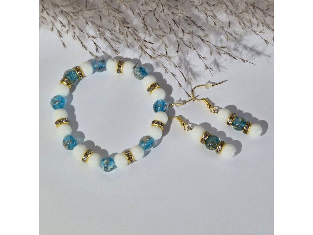 Jemný ručně vyráběný šperkový set složený z náramku a náušnic v krásné kombinaci bílé, modré a zlaté barvy. Spojení achátových korálků a svítících skleněných korálků vytváří elegantní a zároveň originální doplněk.