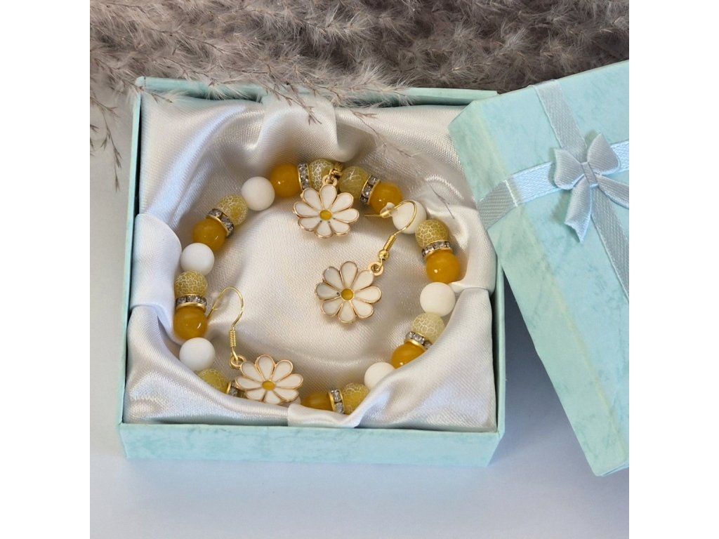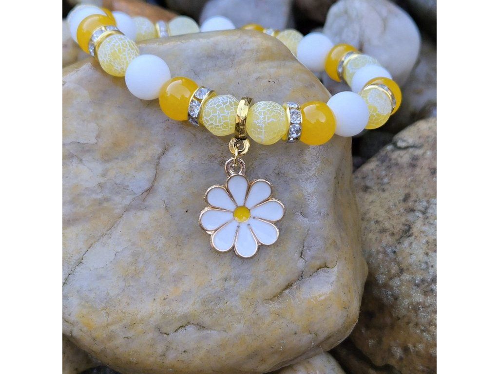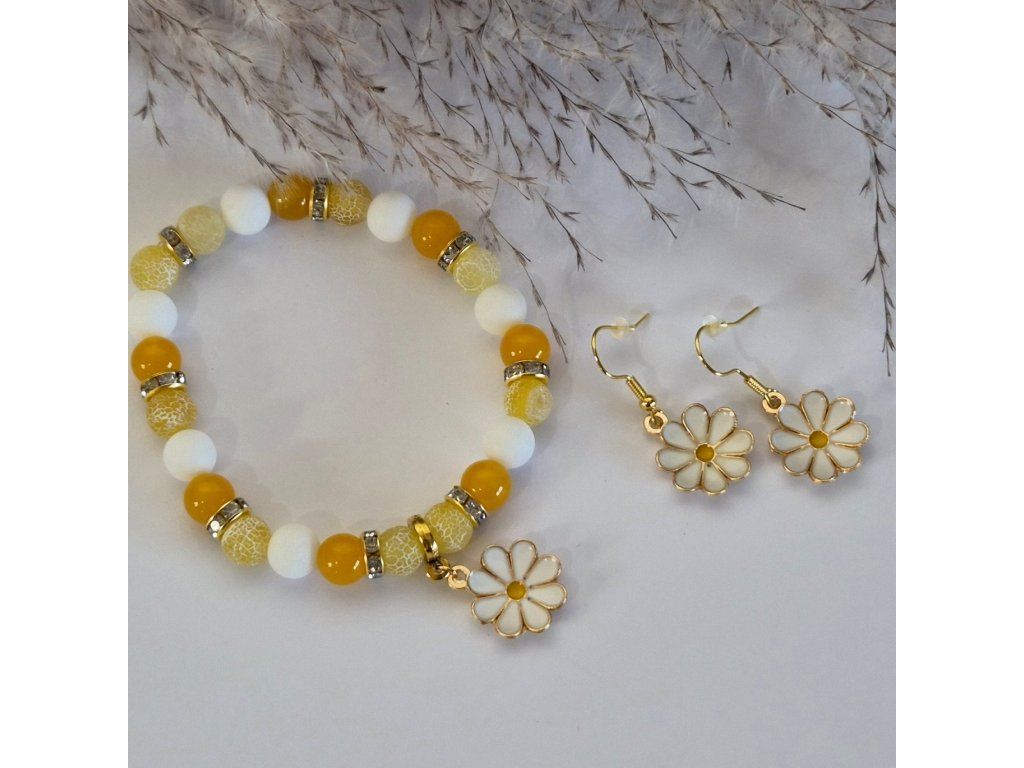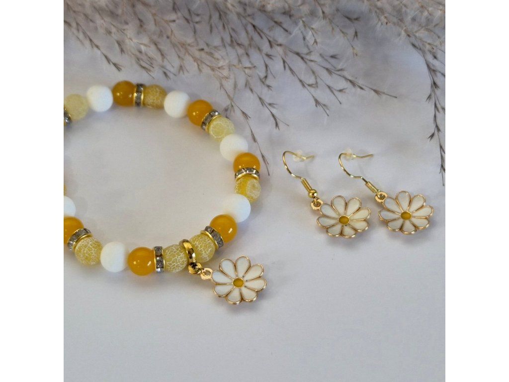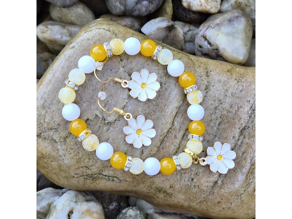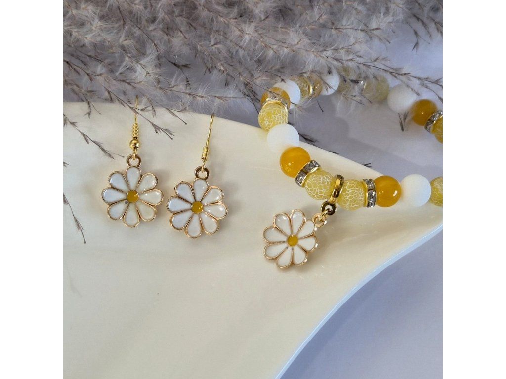 Bílé kamenné korálky dodávají šperku jemnost a čistý vzhled. Žluté korálky z chalcedonu přinášejí energii a světlo, zatímco žlutý praskaný achát vytváří zajímavou strukturu s jemnou kresbou uvnitř korálků. Design doplňují třpytivé rondelky a dekorativní květinový přívěsek, který ladí s náušnicemi.