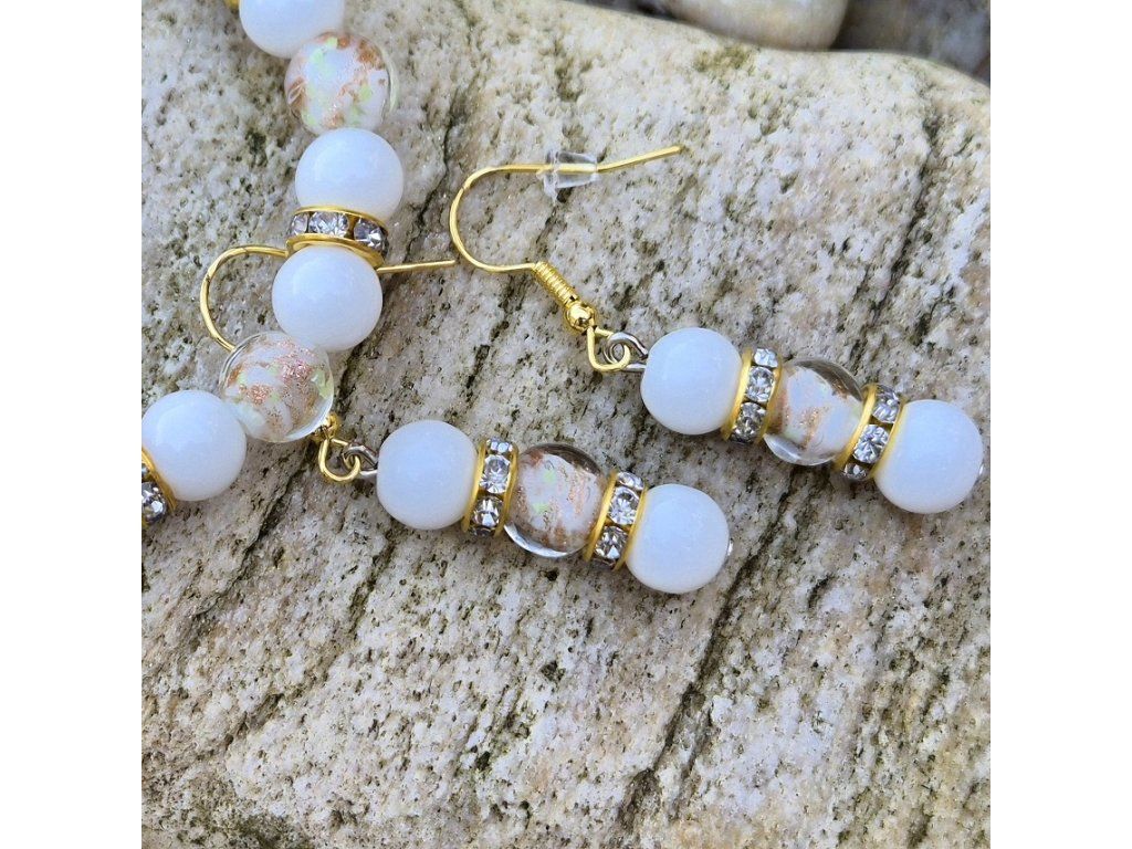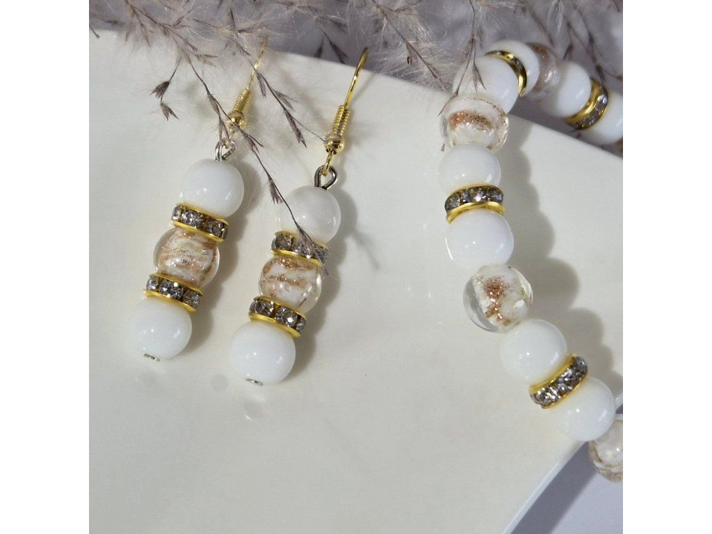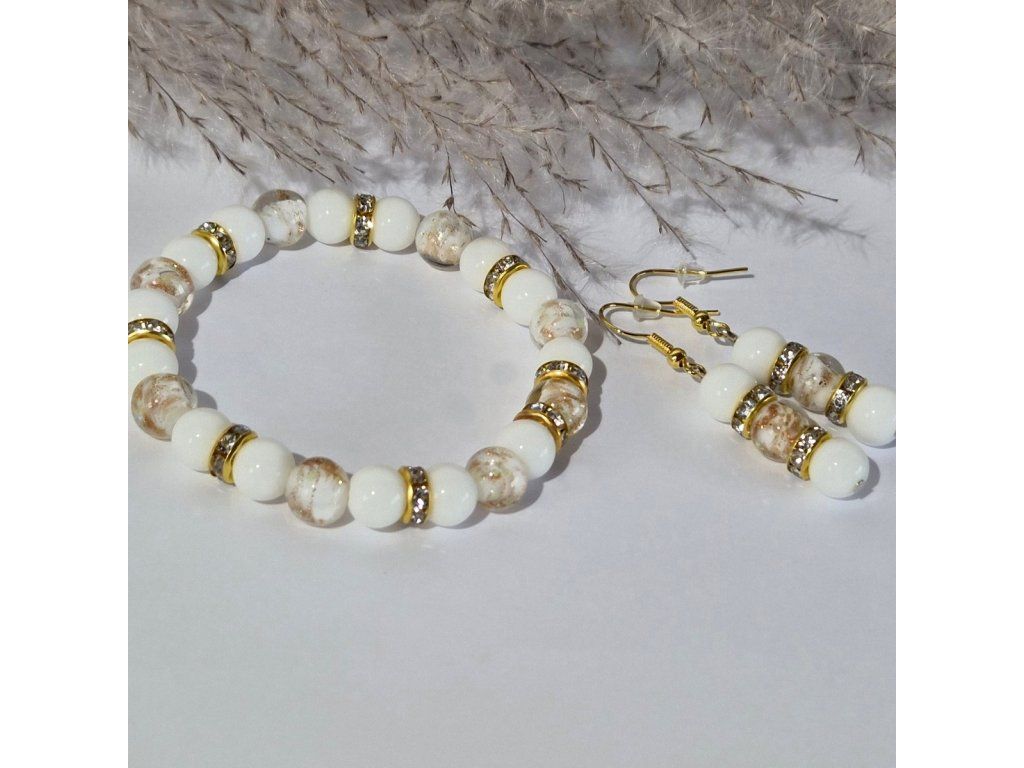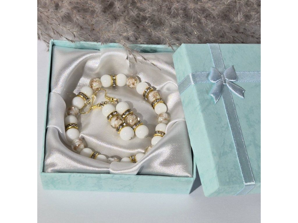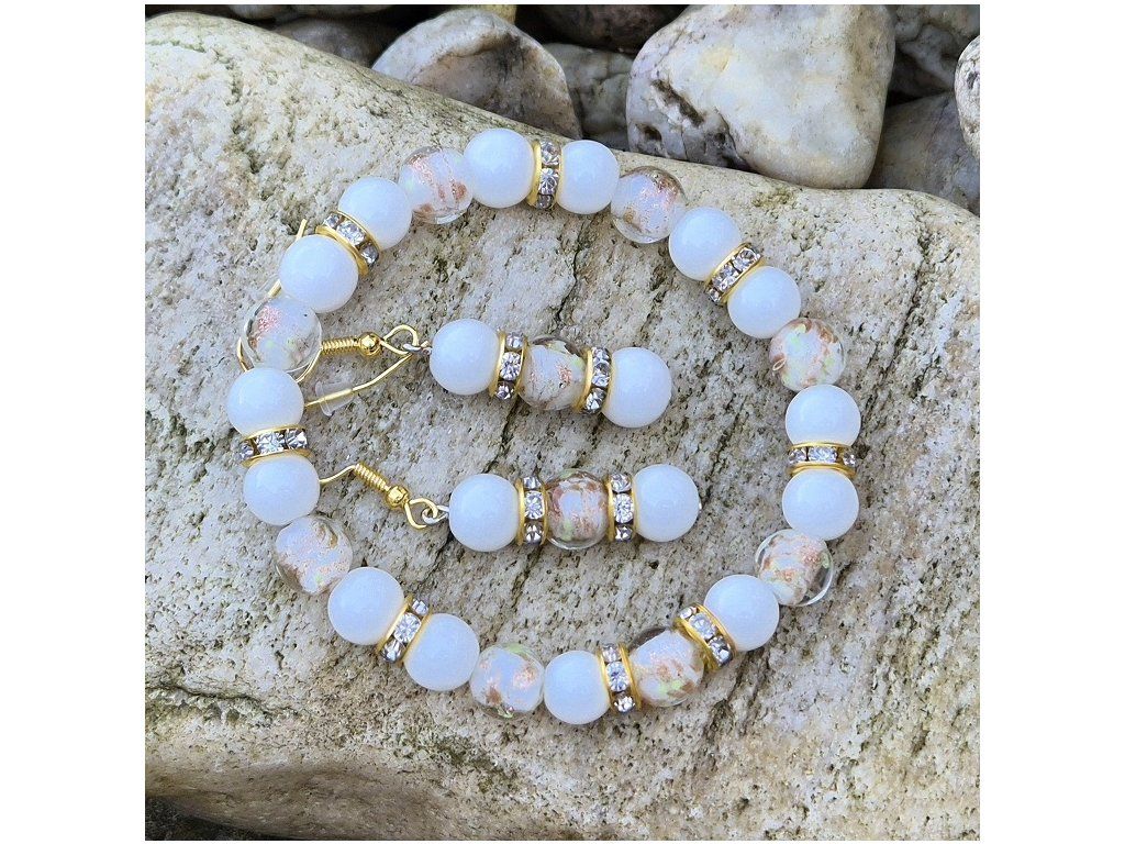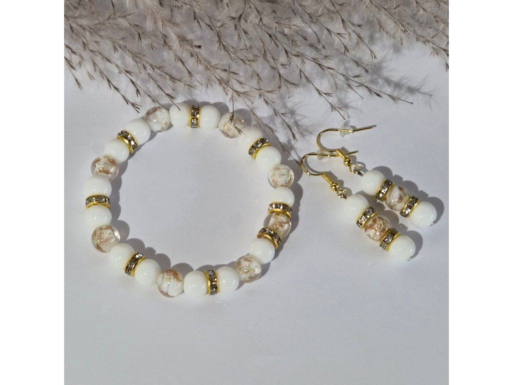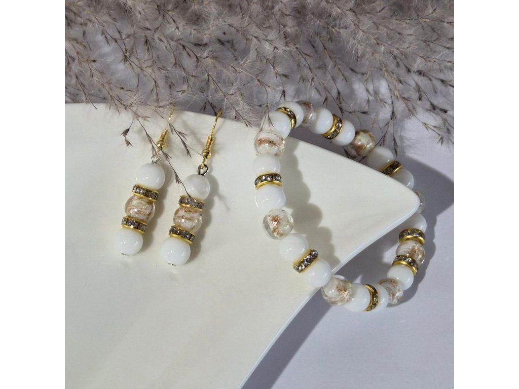 Jemný ručně vyráběný šperkový set složený z náramku a náušnic v elegantní kombinaci bílé a zlaté barvy. Spojení přírodního chalcedonu a svítících skleněných korálků vytváří harmonický a velmi něžný doplněk.