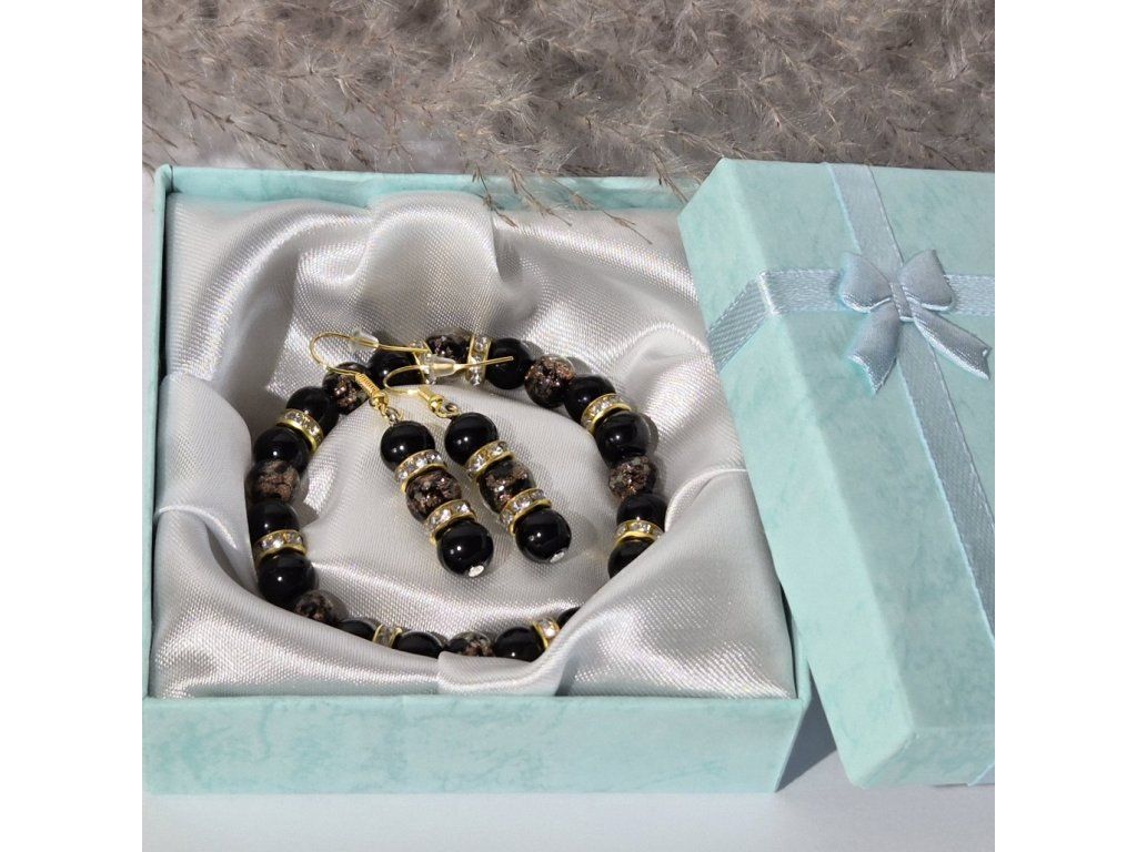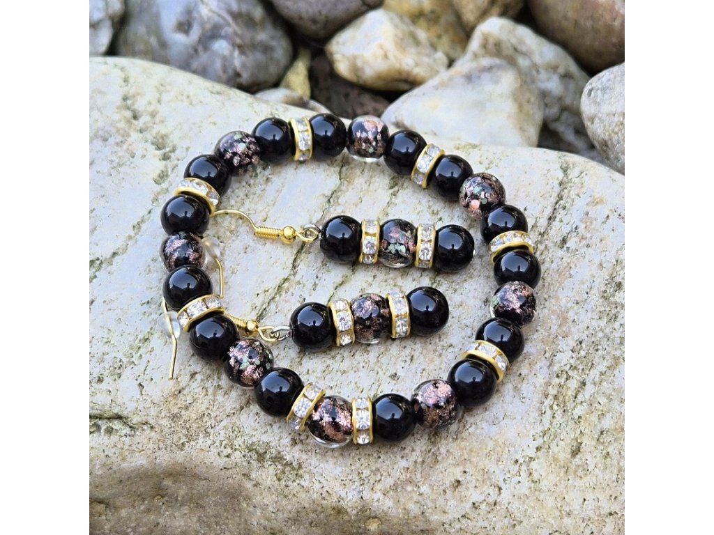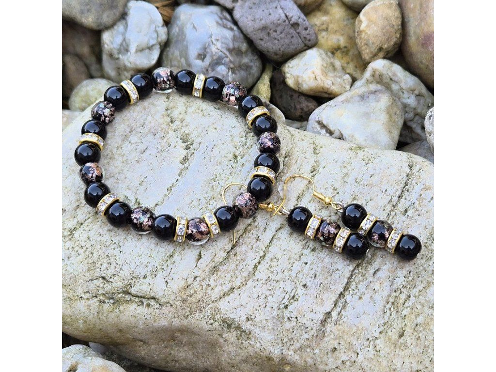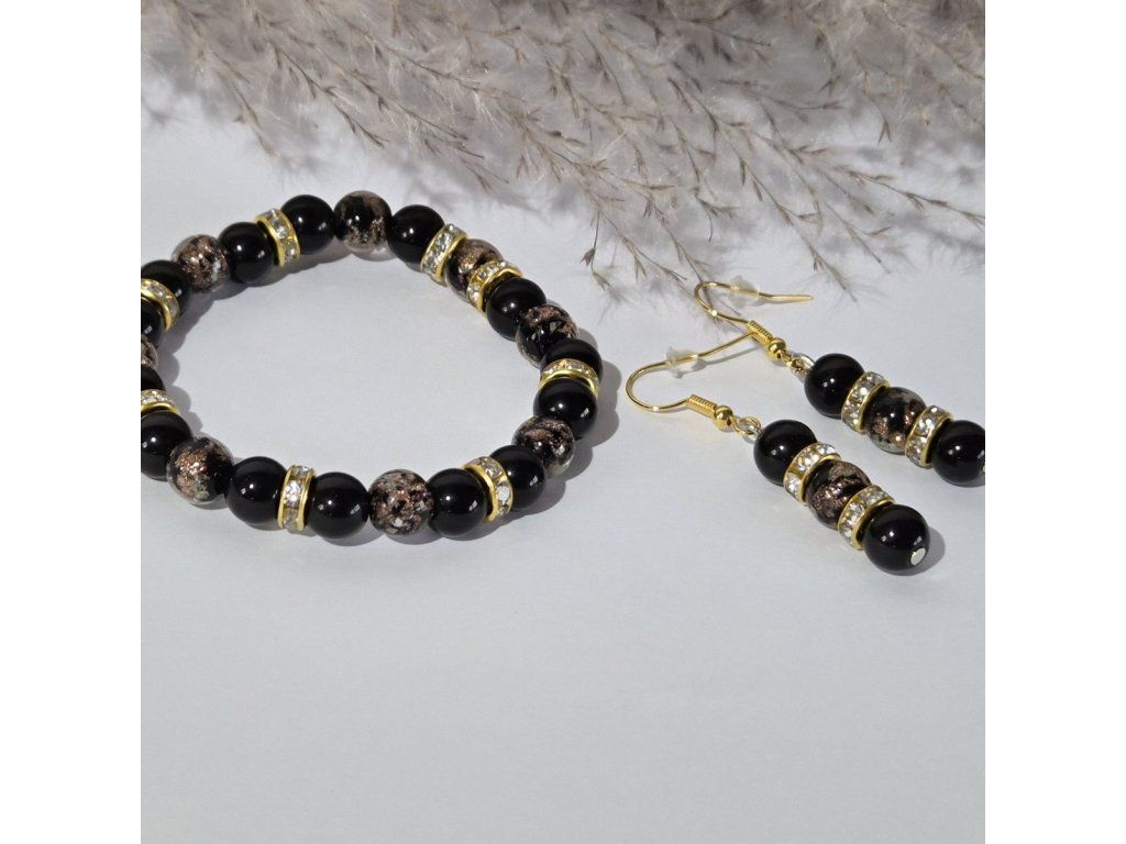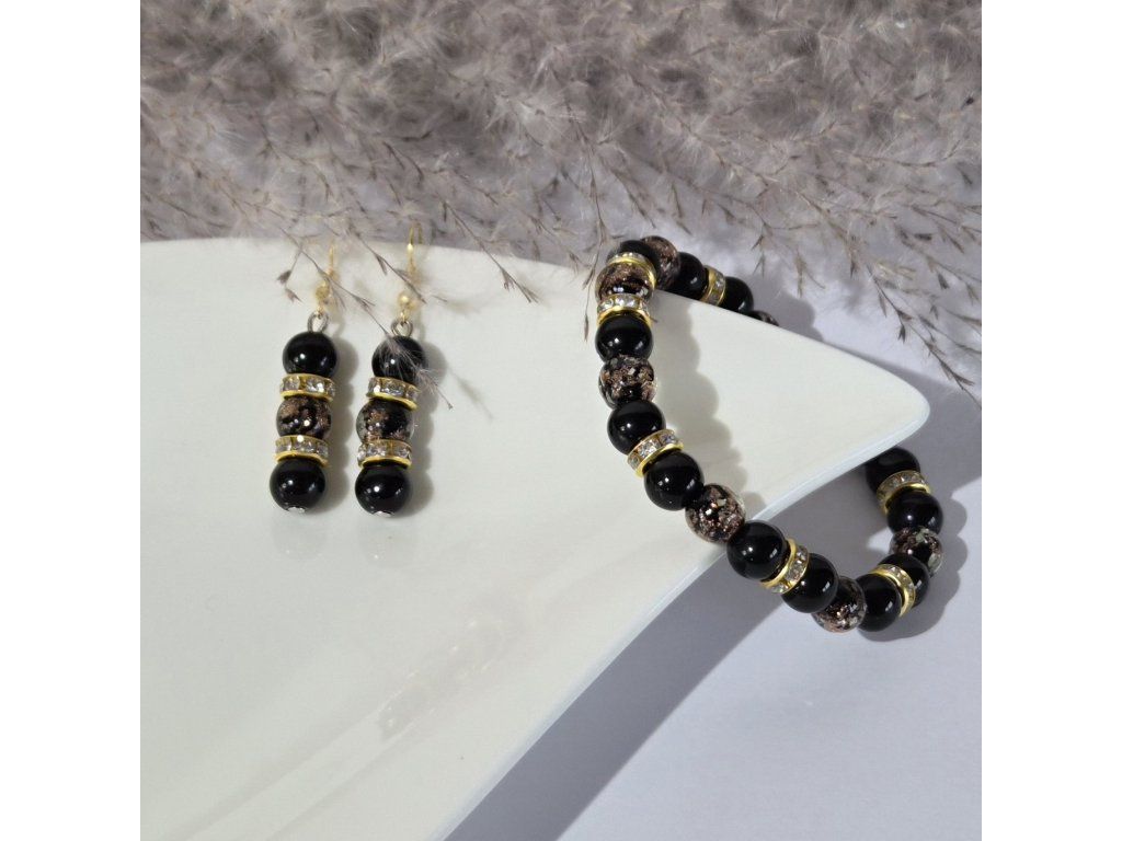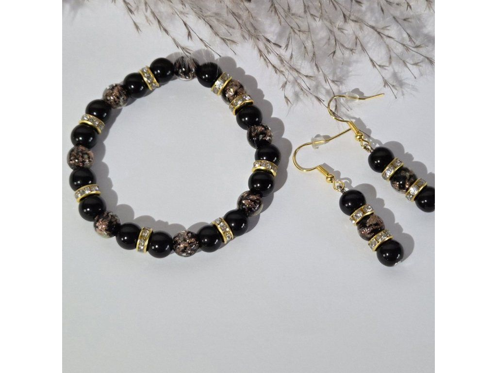 Stylový ručně vyráběný šperkový set složený z náramku a náušnic v elegantní kombinaci černé a zlaté barvy. Spojení přírodního onyxu a skleněných korálků se svítícím efektem vytváří výrazný a zároveň luxusně působící doplněk.