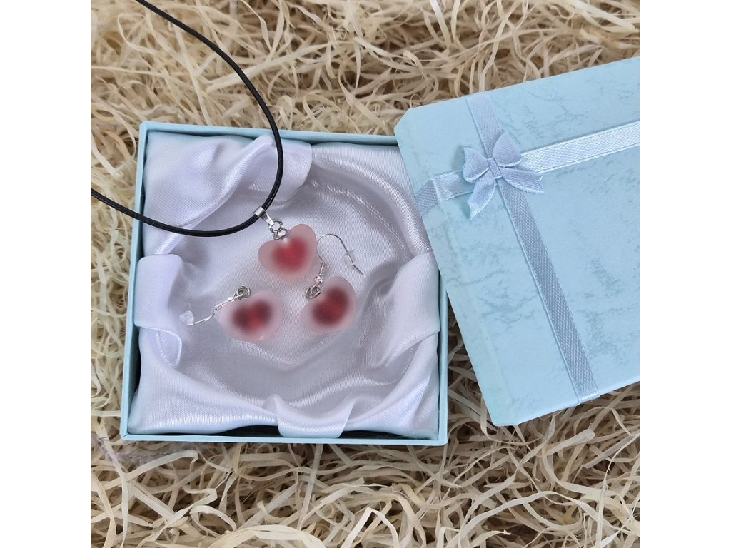 Dominantním prvkem jsou srdíčka z matného materiálu s jemně mléčným povrchem. Uprostřed každého srdce se prolíná sytější červený odstín, který se postupně rozplývá do jemné růžové. Tento efekt dodává šperku hloubku a působí velmi něžně a ženským dojmem. Matný povrch zajišťuje decentní vzhled bez výrazného lesku a působí sametově.