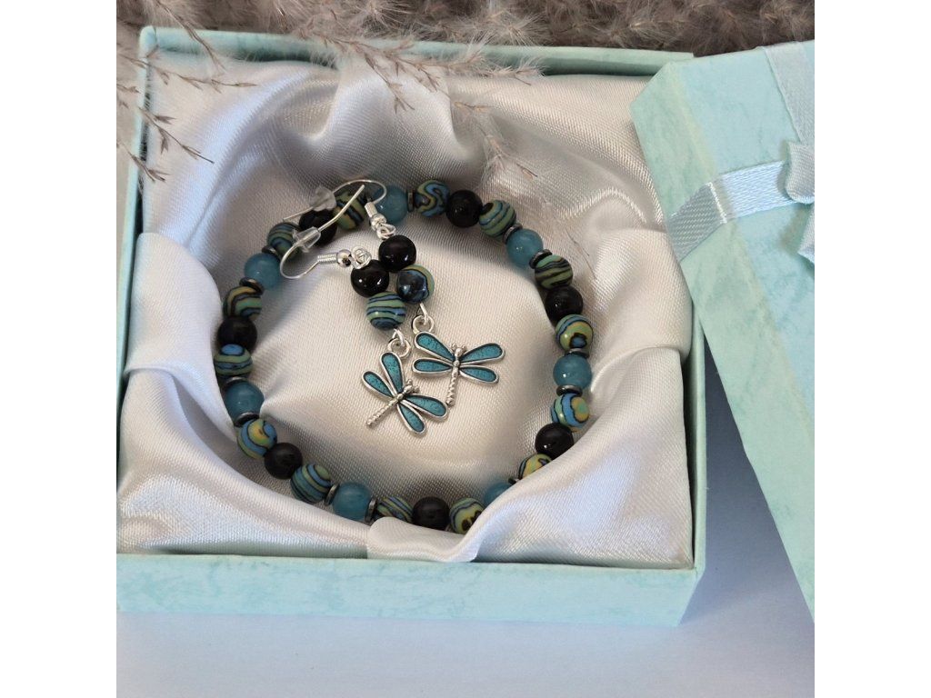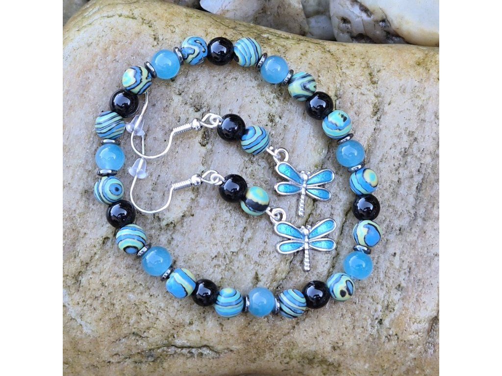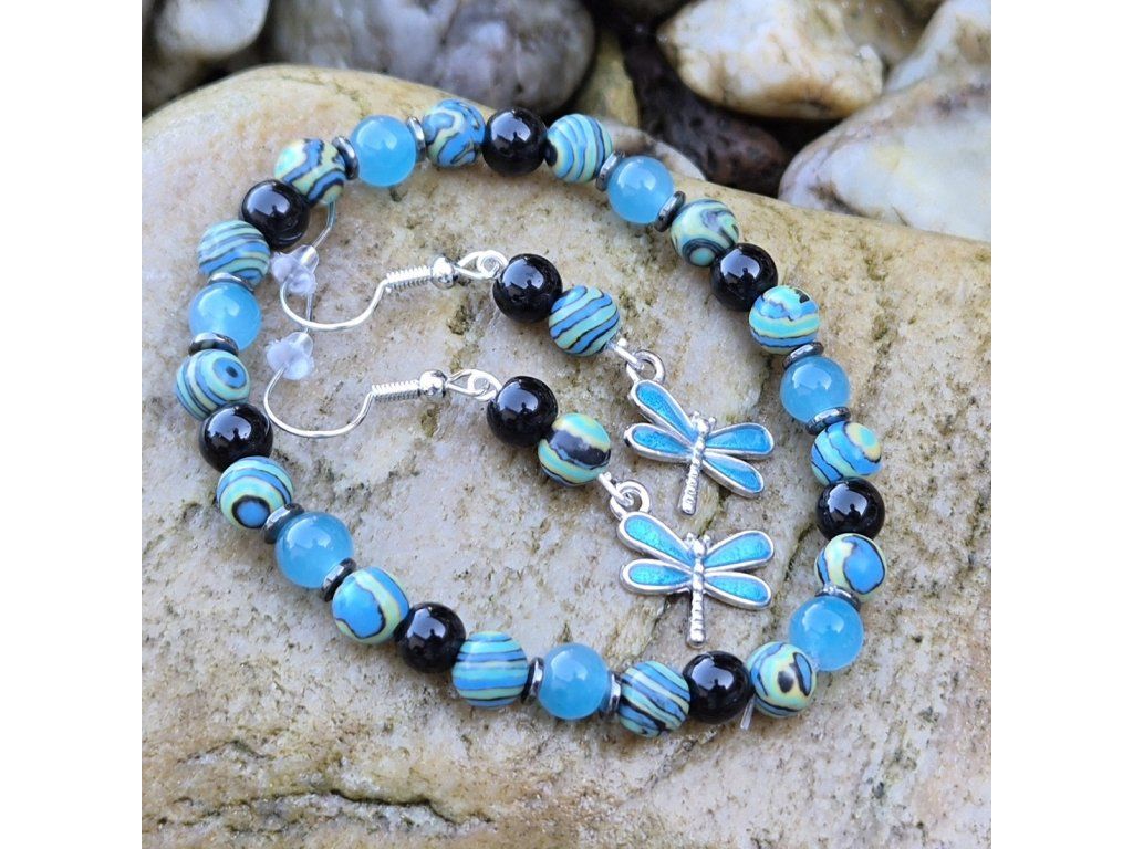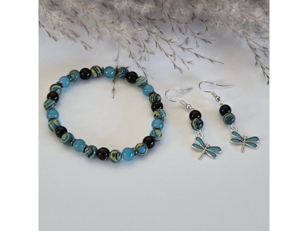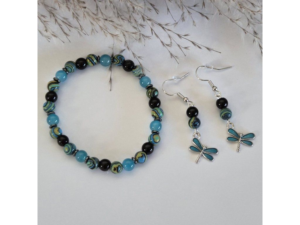 Tyto korálky jsou doplněny tyrkysovými a černými skleněnými korálky, které vytvářejí harmonickou barevnou kombinaci. Jemné onyxové rondelky dodávají šperku elegantní kontrast a celkový design završují náušnice s dekorativním přívěskem vážky, symbolem lehkosti a proměny.