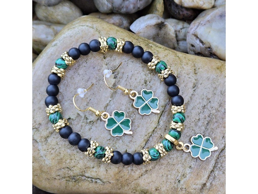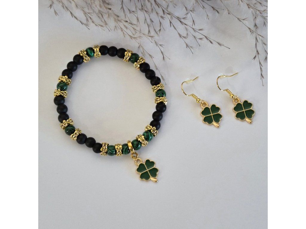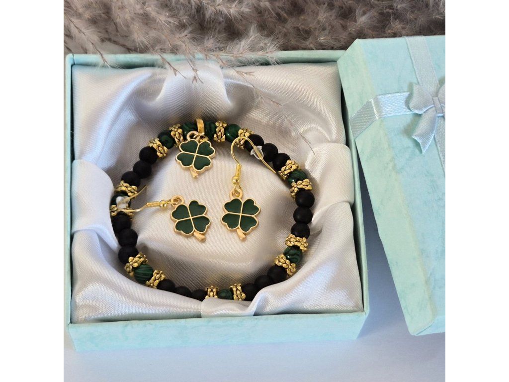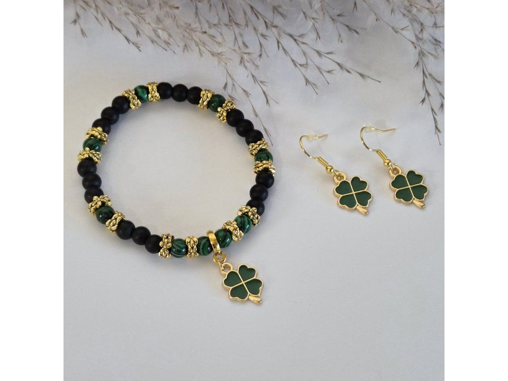 Luxusní vzhled dodávají šperku zlaté dekorativní mezikorálky a stylový přívěsek ve tvaru čtyřlístku, který se opakuje také na náušnicích. Tento motiv je symbolem štěstí a prosperity, díky čemuž je set ideálním osobním talismanem nebo krásným dárkem.