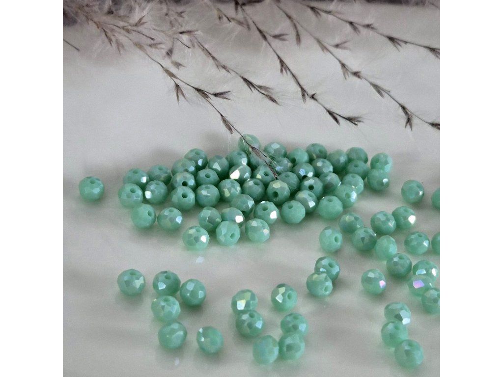 Dekorativní fasetované korálky z umělého skla v jemné mint zelené barvě. Díky broušenému povrchu vytvářejí krásné odlesky světla, které dodávají šperkům svěží a elegantní vzhled.