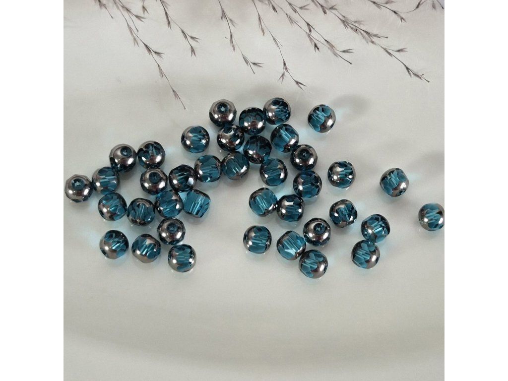 Stylové broušené korálky ze skla s efektní kombinací tyrkysové průhledné barvy a kovově stříbrného pokovení. Fasetované plošky krásně lámou světlo a dodávají korálkům výrazný třpyt.
