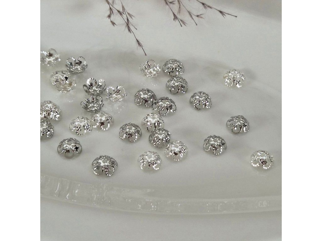 Dekorativní pětilisté kaplíky na korálky, které slouží jako ozdobné zakončení korálků při výrobě šperků. Díky jemnému prolamovanému vzoru vytvářejí elegantní a vzdušný vzhled, který krásně doplní minerální, skleněné i kovové korálky.