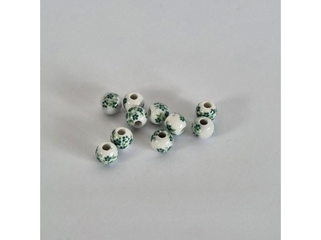 Keramické korálky - bílá se zeleným dekorem - ø 8 mm - 10 ks