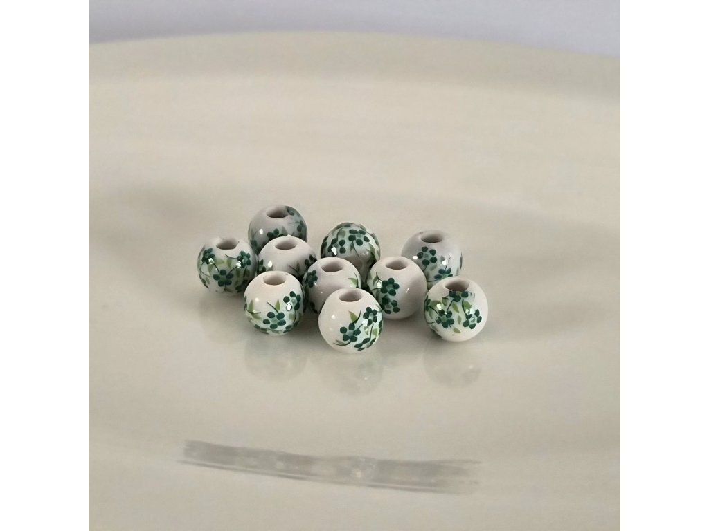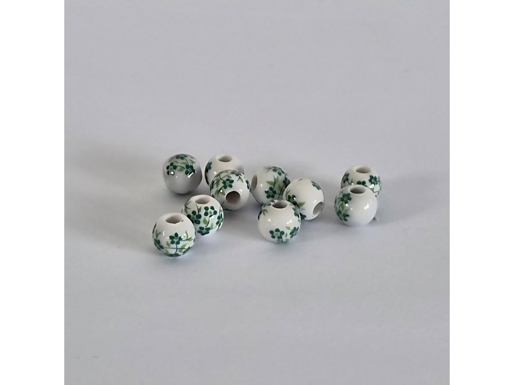 Elegantní keramický korálek o průměru 8 mm s jemným zeleným květinovým vzorem na bílém podkladu. Díky kvalitní glazuře má hladký, lesklý povrch a výrazné, syté barvy, které krásně vyniknou v každém šperku.