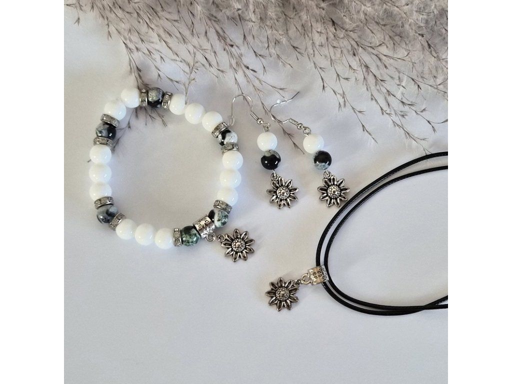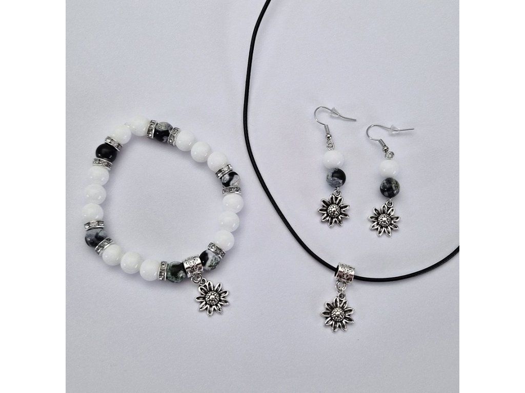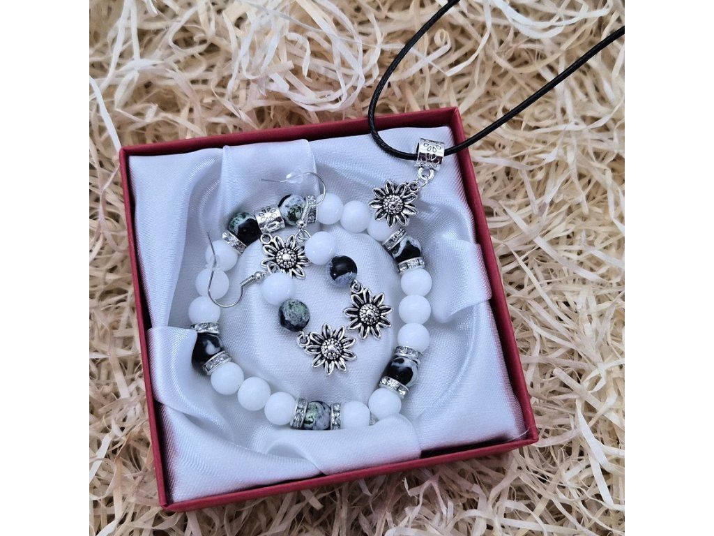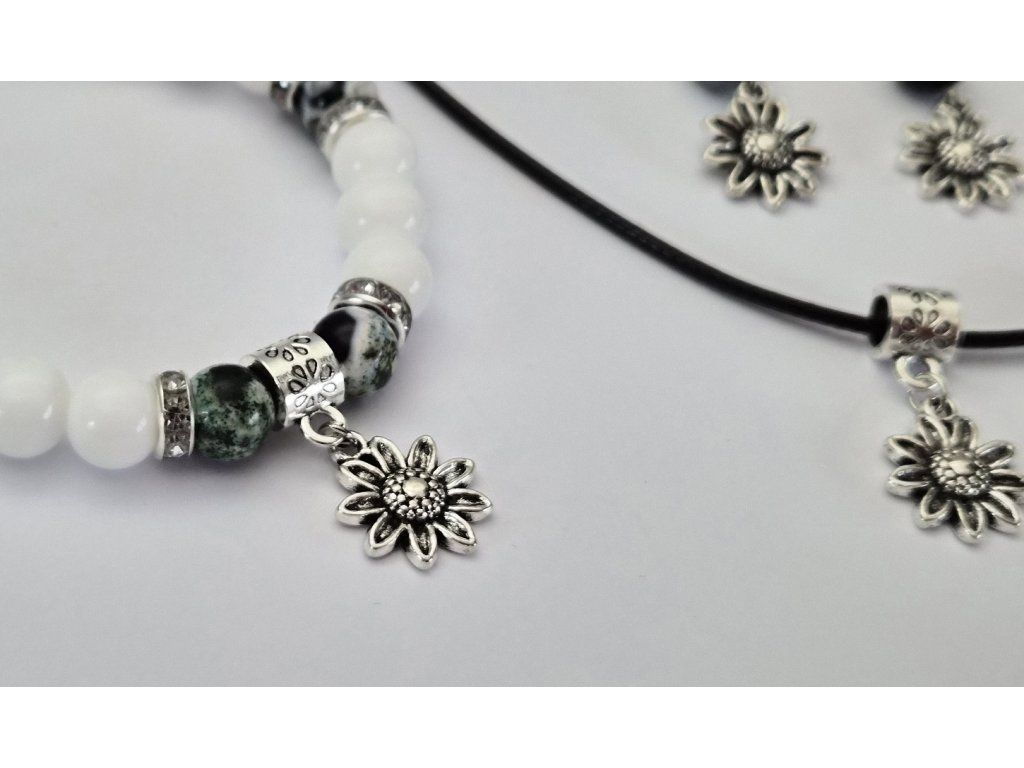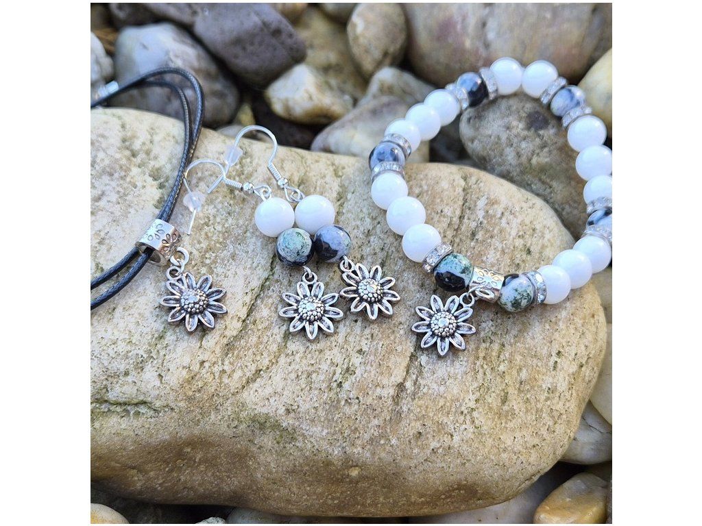 Výrazný a přesto jemně působící šperkový set složený z náramku, náušnic a náhrdelníku s přívěskem. Kombinace bílých korálků a žíhaného přírodního zeleného ohnivého achátu vytváří harmonický celek s přírodním charakterem a elegantním nádechem.