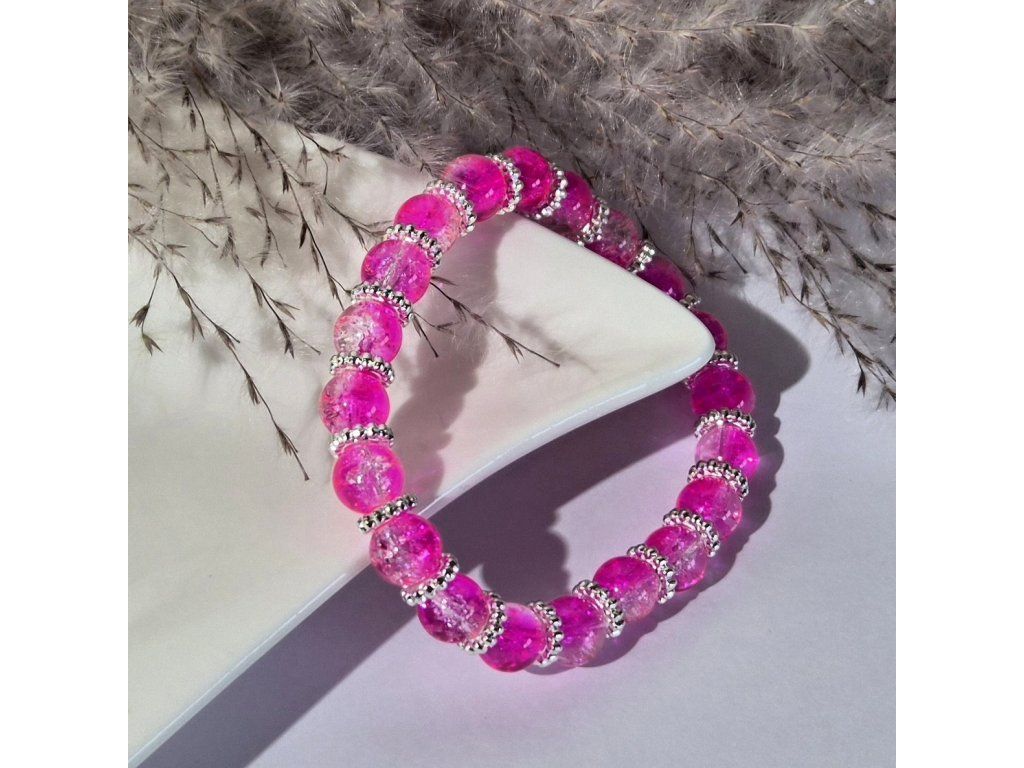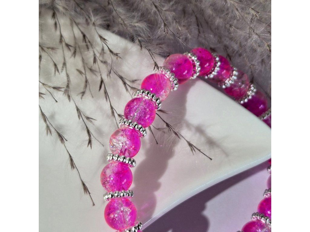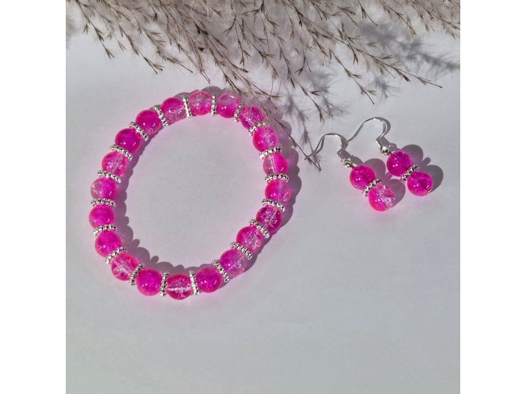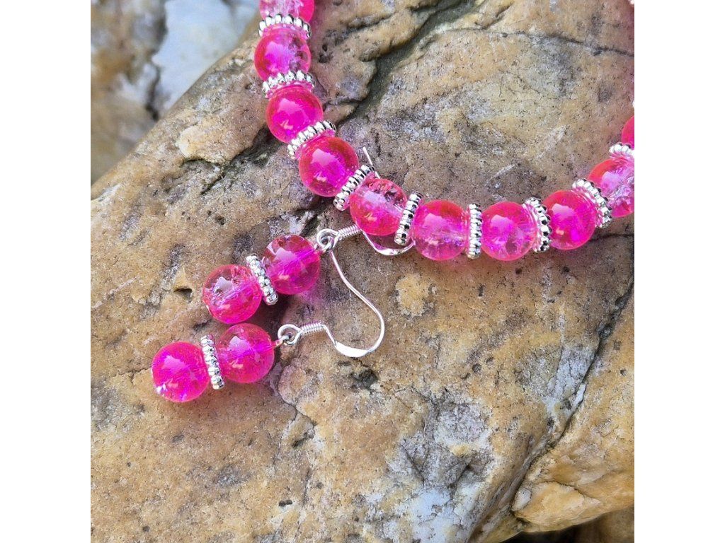 Výrazný a zároveň hravý šperkový set složený z náramku a náušnic v zářivé růžové barvě. Kombinace praskaných skleněných korálků a dekorativních slitinových mezikorálků vytváří zajímavý třpytivý efekt, který krásně odráží světlo.