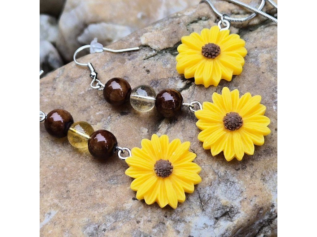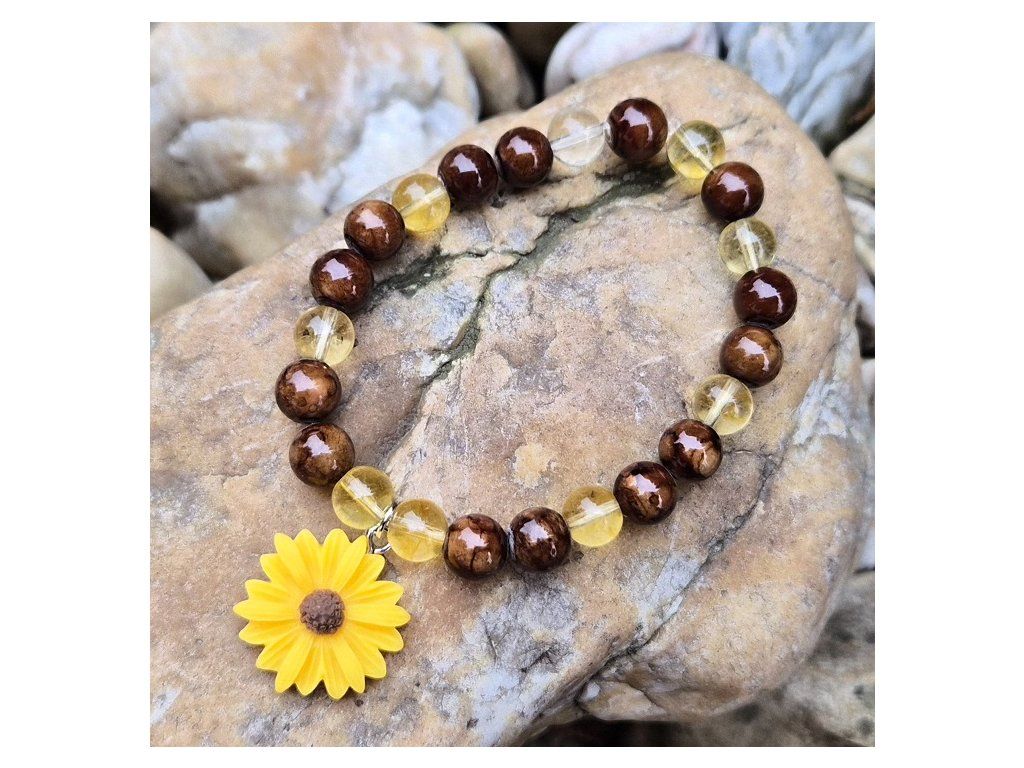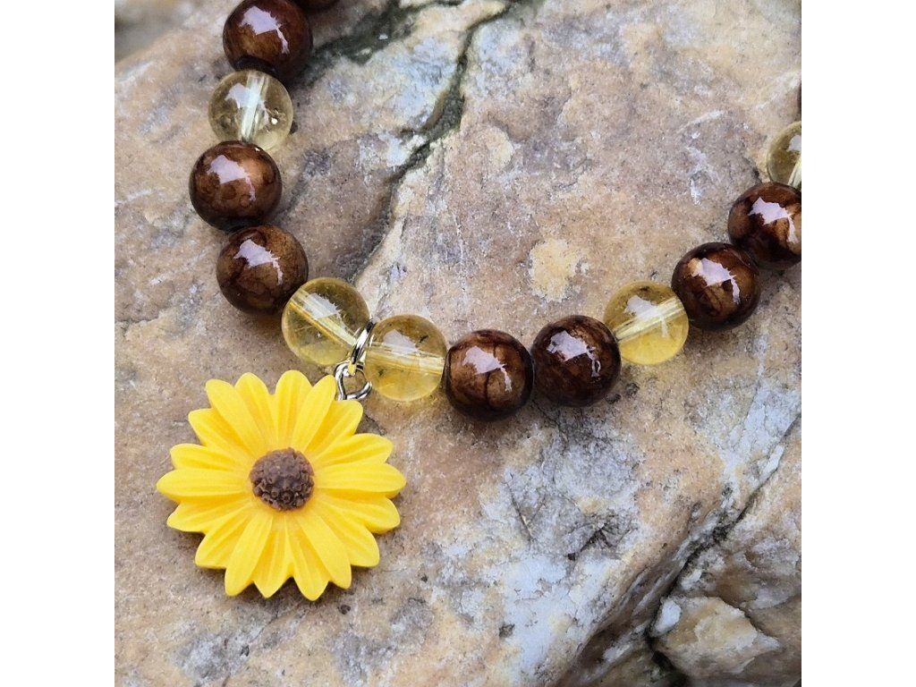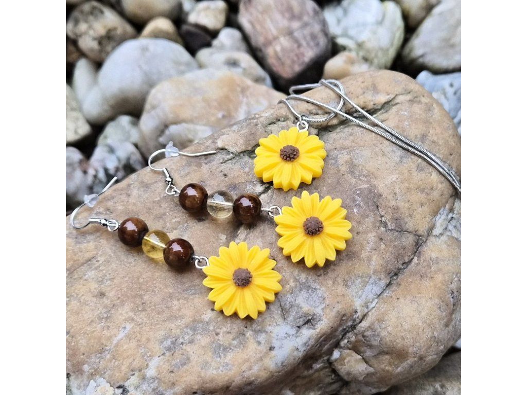 Elegantní a přitom svěží šperkový set složený z náramku, náušnic a náhrdelníku s přívěskem ve tvaru slunečnice. Kombinace hnědého chalcedonu a žlutého přírodního citrínu Xulin vytváří harmonii teplých zemitých tónů a sluneční energie.