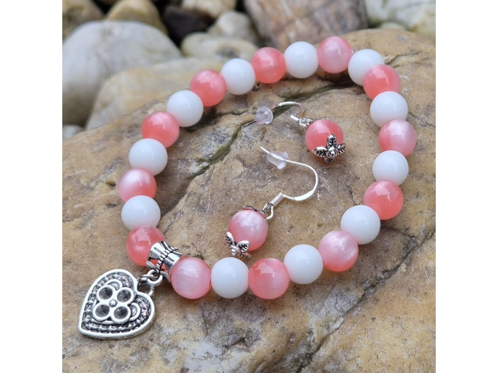 Romantický a něžný šperkový set složený z náramku a náušnic v jemné kombinaci bílé a růžové barvy. Spojení bílých achátových korálků a růžových pryskyřnicových korálků s efektem kočičího oka vytváří harmonický celek plný svěžesti a ženské elegance.