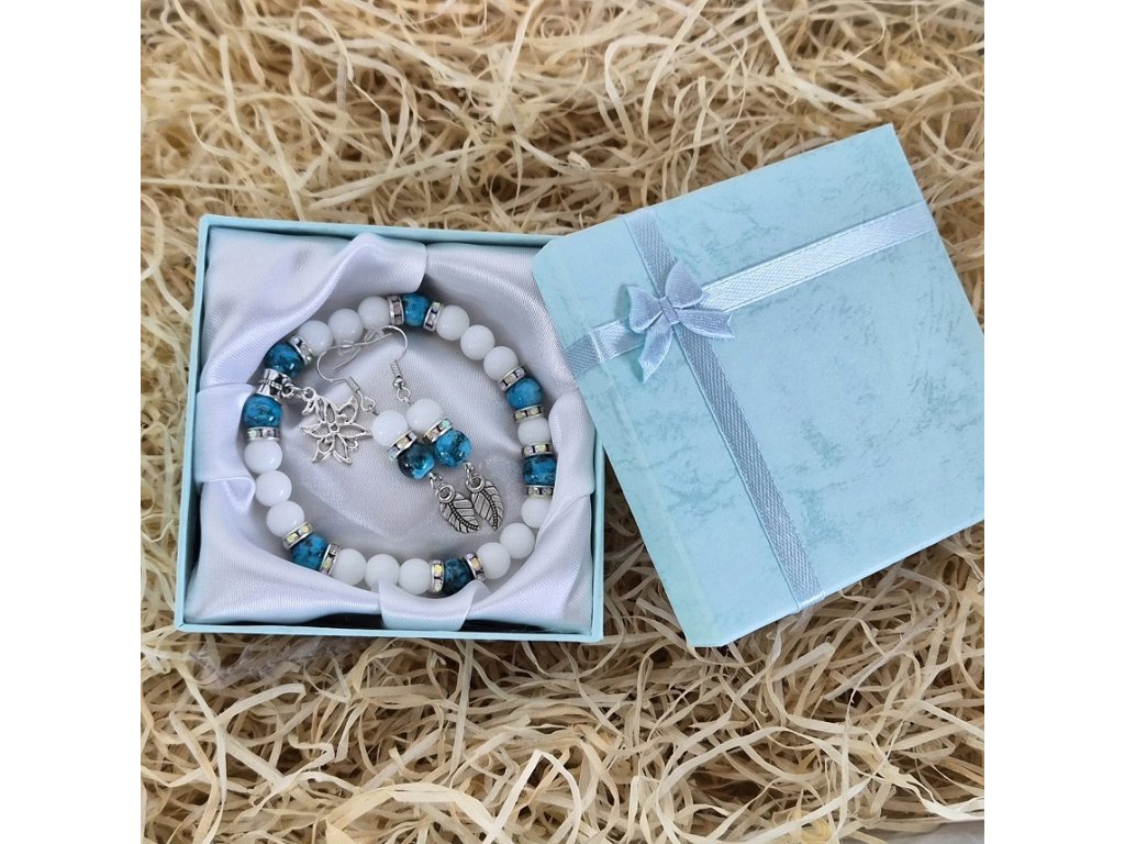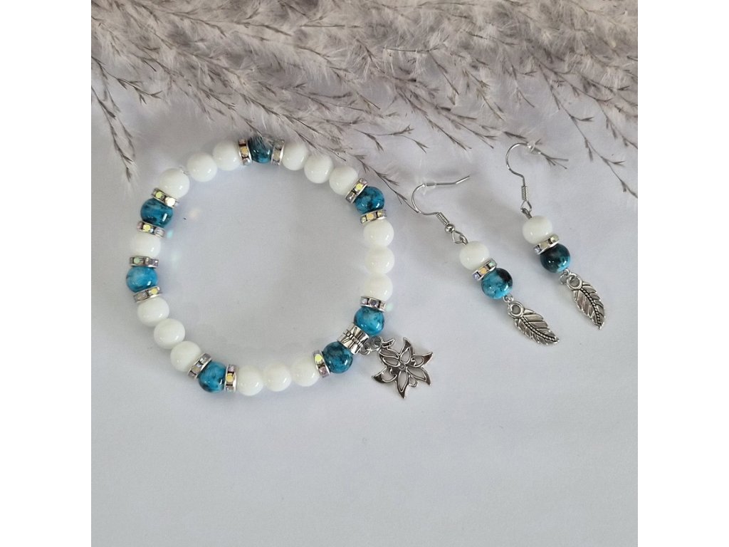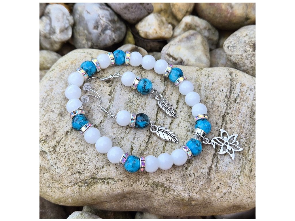 Jemný a elegantní šperkový set složený z náramku a náušnic v harmonické kombinaci přírodního bílého chalcedonu a dvoubarevných skleněných korálků v odstínech tyrkysové a modré. Celek působí svěže, čistě a velmi ženským dojmem.