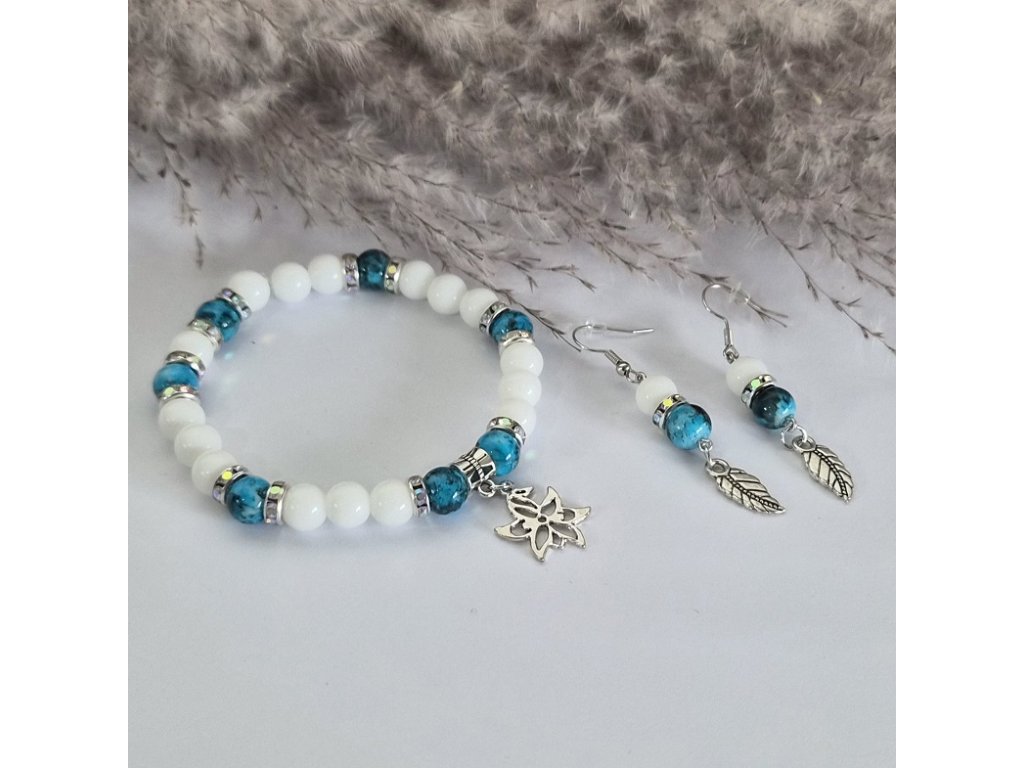 Náramek je doplněn elegantním přívěskem ve tvaru květu a náušnice jsou ozdobeny jemným kovovým lístkem, což dodává šperku lehký přírodní nádech.
