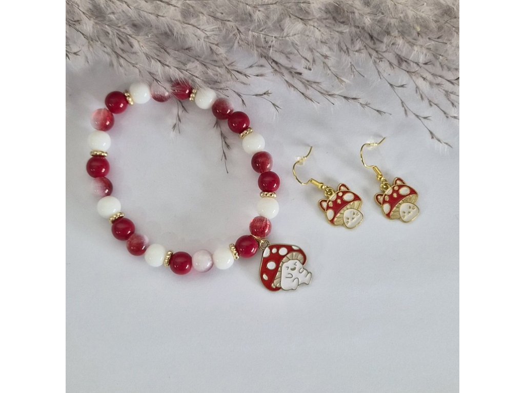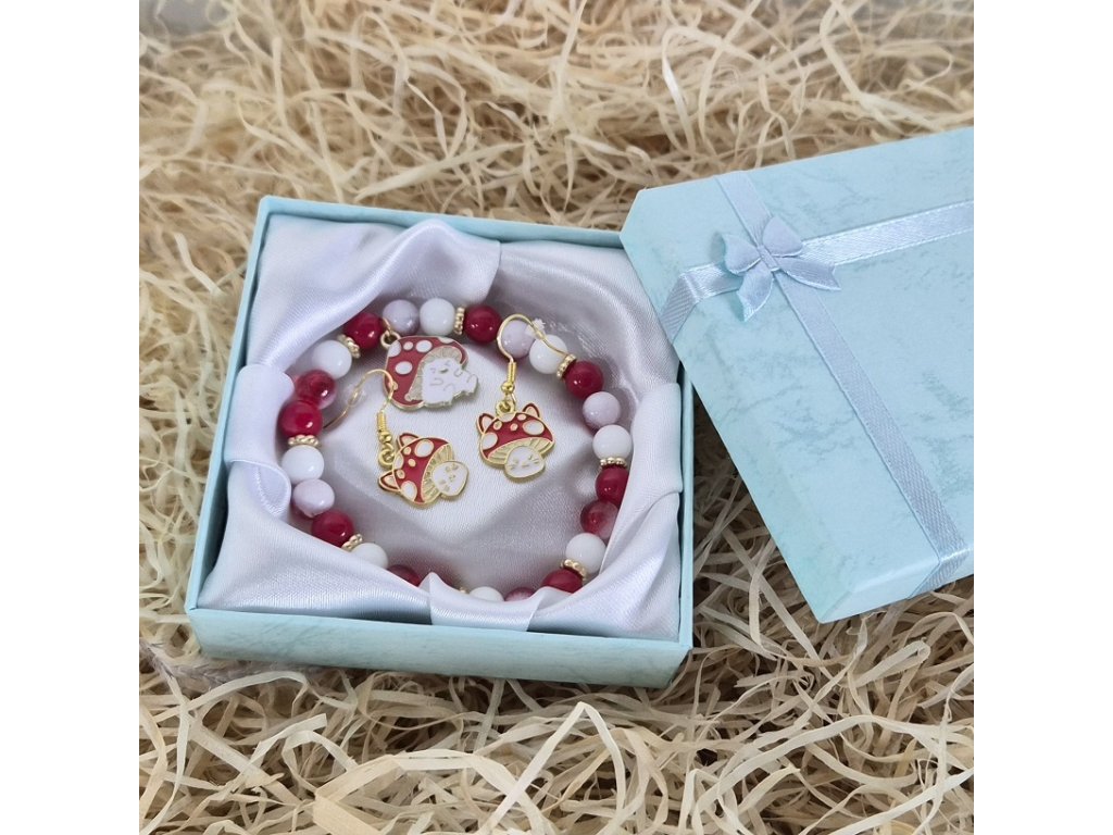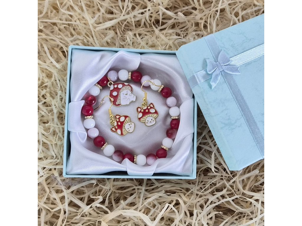 Součástí designu jsou také dekorativní zlatavé mezidíly, které podtrhují barevnou kompozici a dodávají šperku elegantní detail. Dominantním prvkem je stylový přívěsek a náušnice s motivem roztomilé houbičky, které celému setu propůjčují osobitý charakter.