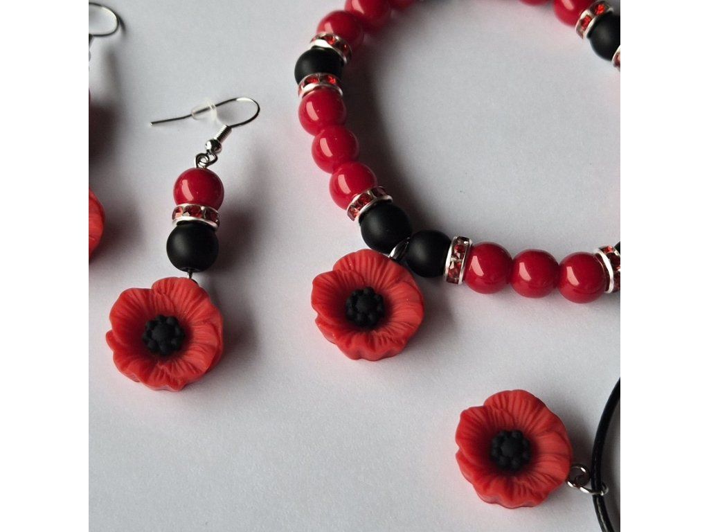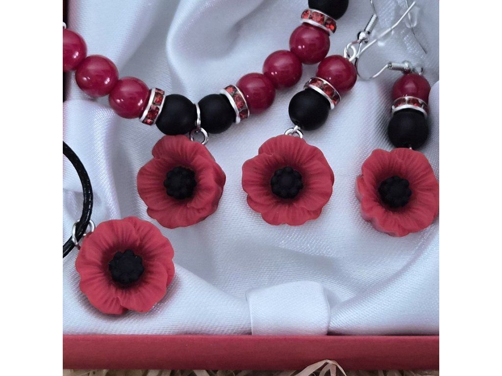 Korálkový set z onyxu a červeného jaspisu - vlčí máky - ø 8 mm