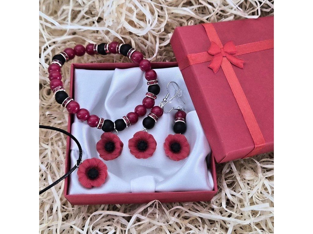 Dominantním prvkem jsou plastické květy z pryskyřice v sytě červené barvě. Kovové rondelky se štrasem jemně oddělují jednotlivé korálky a dodávají celku elegantní lesk. Set působí ženským, lehce romantickým dojmem, ale zároveň si zachovává moderní charakter.