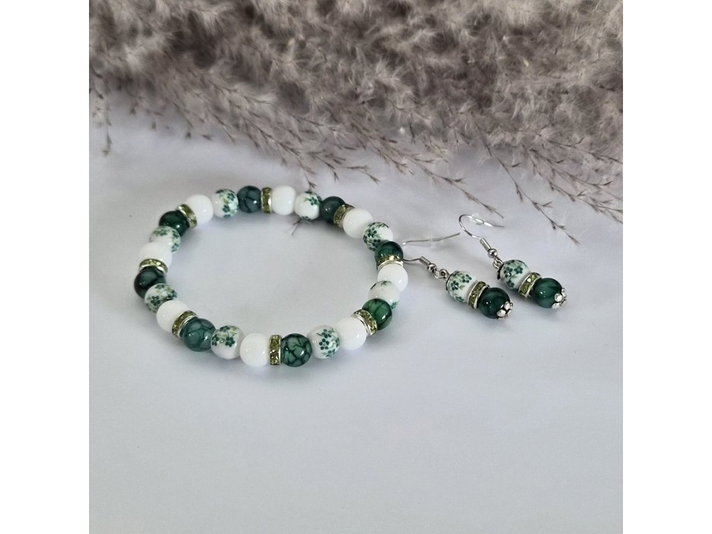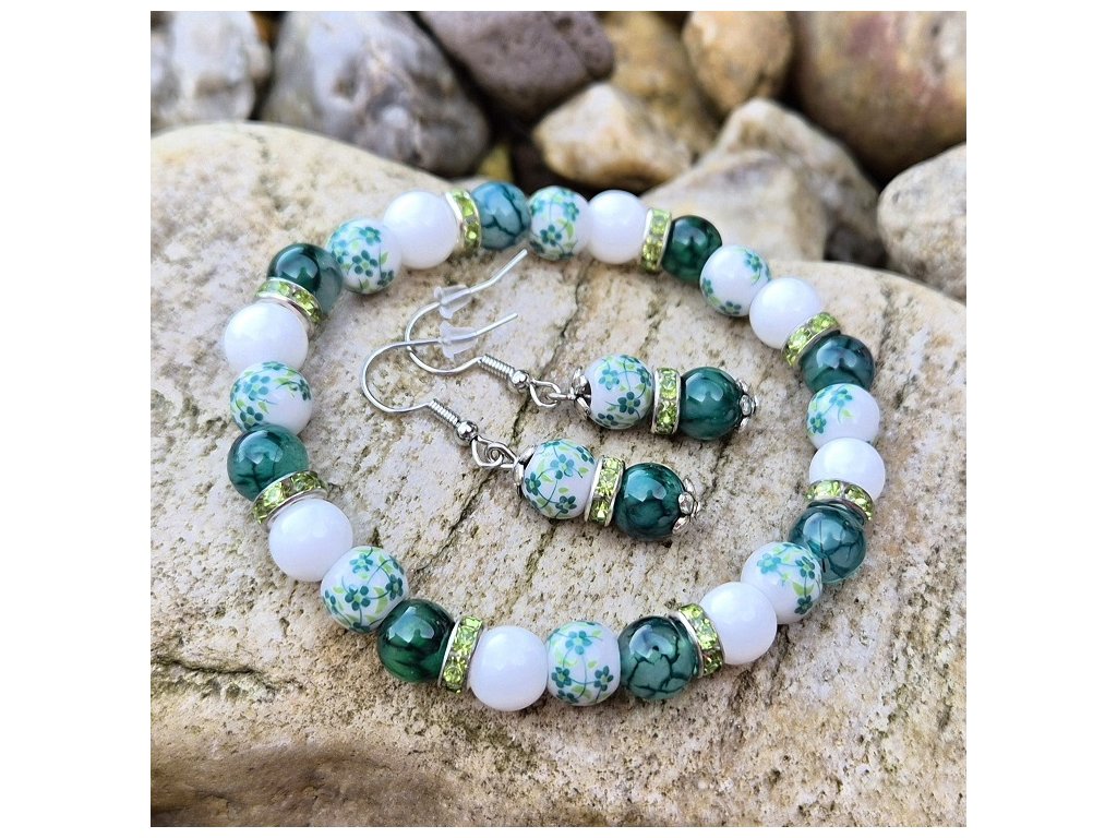 Elegantní a svěží šperkový set složený z náramku a náušnic v harmonické kombinaci zeleného achátu, keramických korálků s jemným květinovým motivem a bílých matných skleněných korálků. Celek působí lehce, přírodně a velmi ženským dojmem.