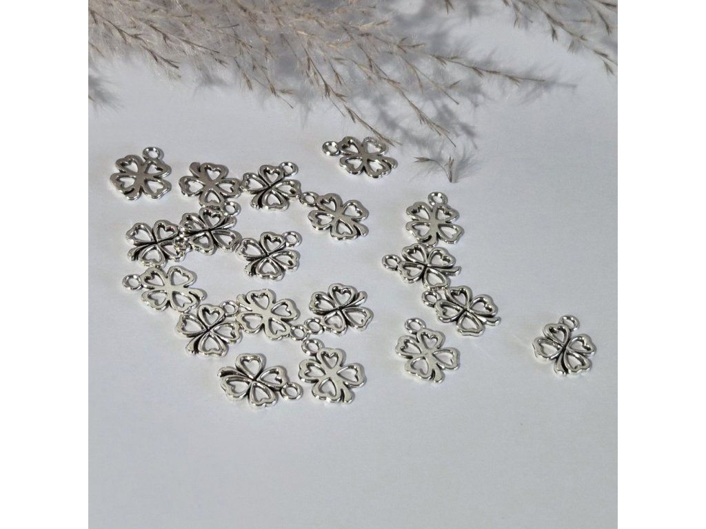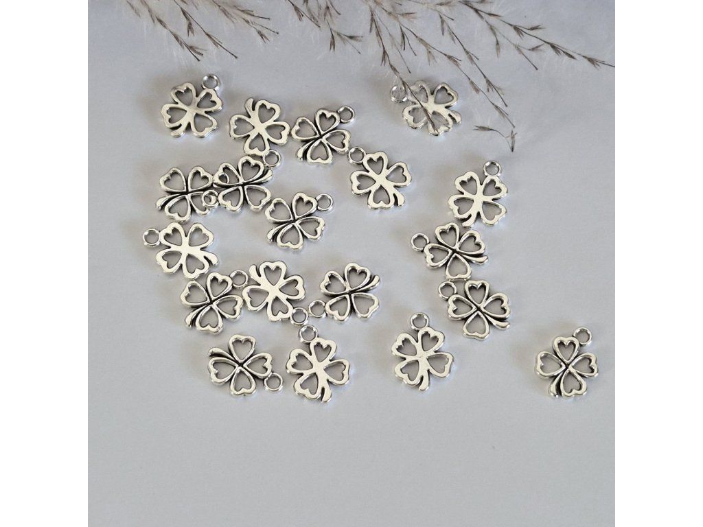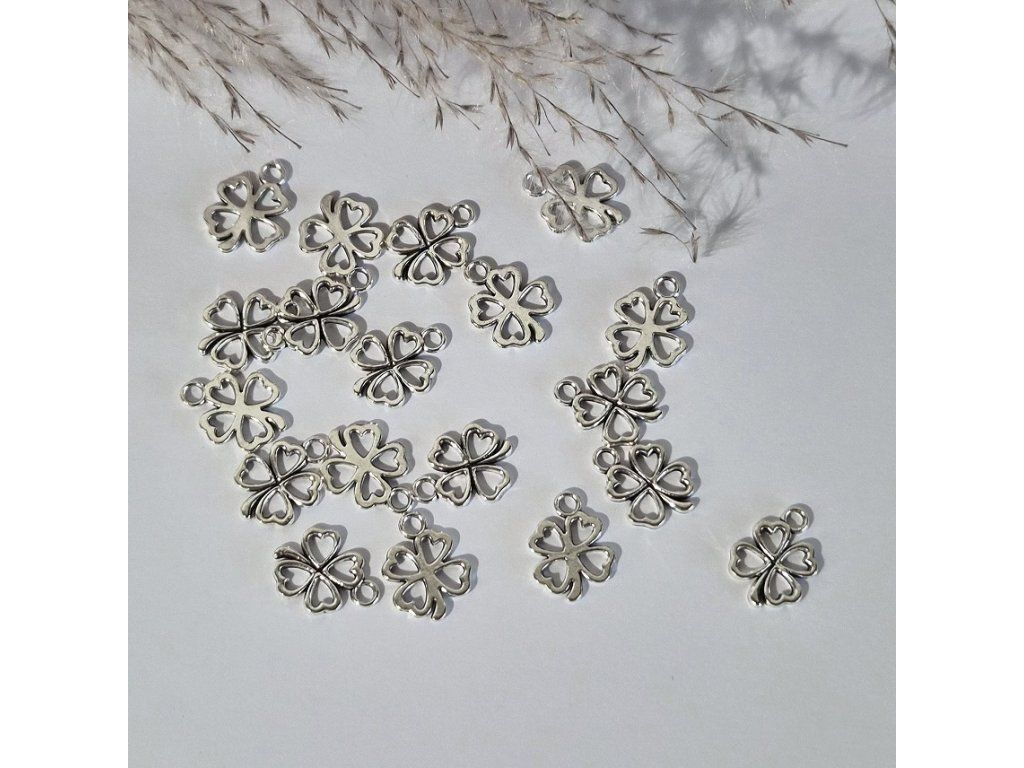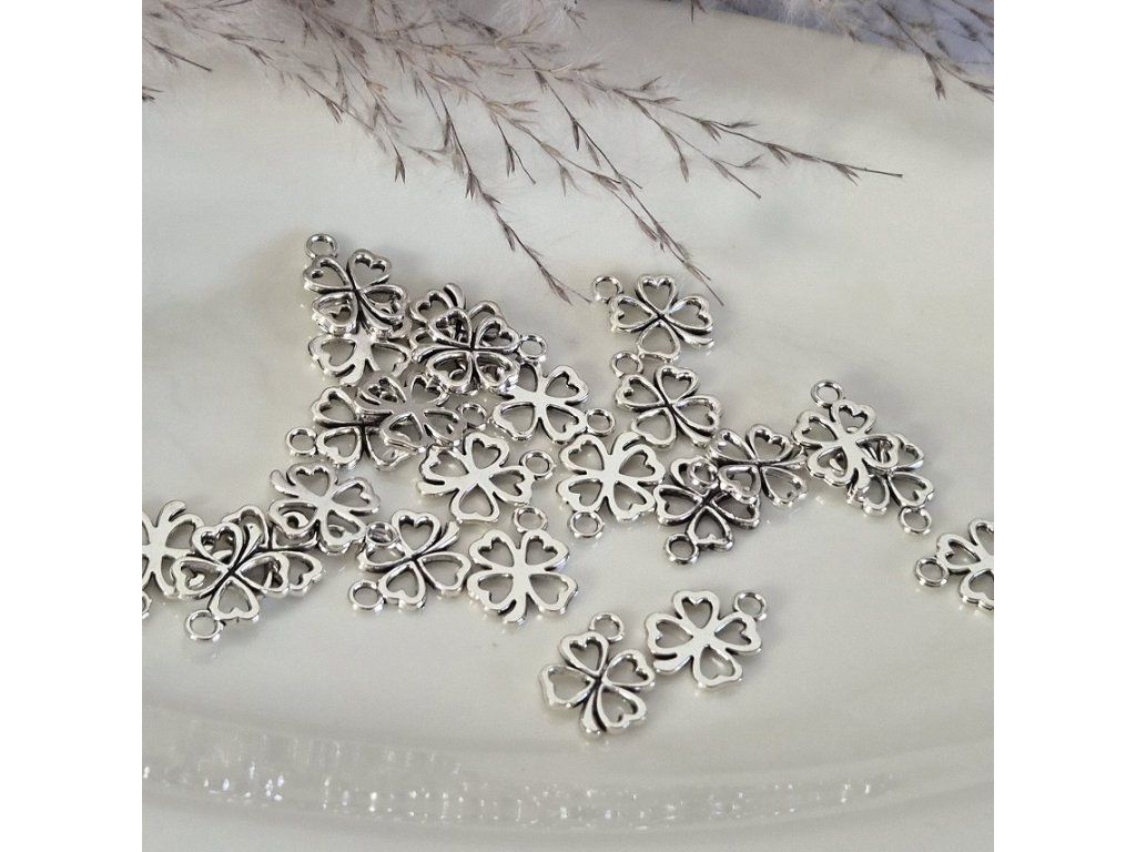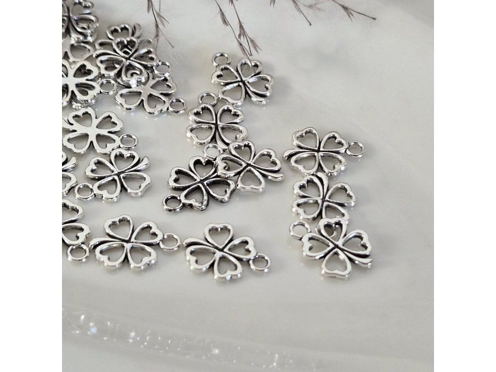 Stylový přívěsek ve tvaru čtyřlístku ve stříbrném provedení z kvalitní zinkové slitiny. Jemný design s motivem srdíček v jednotlivých lístcích působí elegantně a romanticky, což z něj činí ideální komponent pro tvorbu originálních šperků.