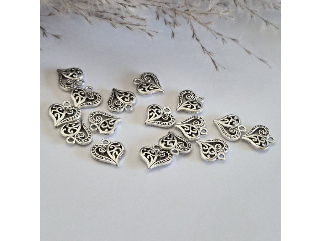 Elegantní kovový přívěsek ve tvaru srdce v jemném stříbrném provedení. Detailní ornamentální zdobení a dutý design dodávají přívěsku lehkost a zároveň originální vintage vzhled.