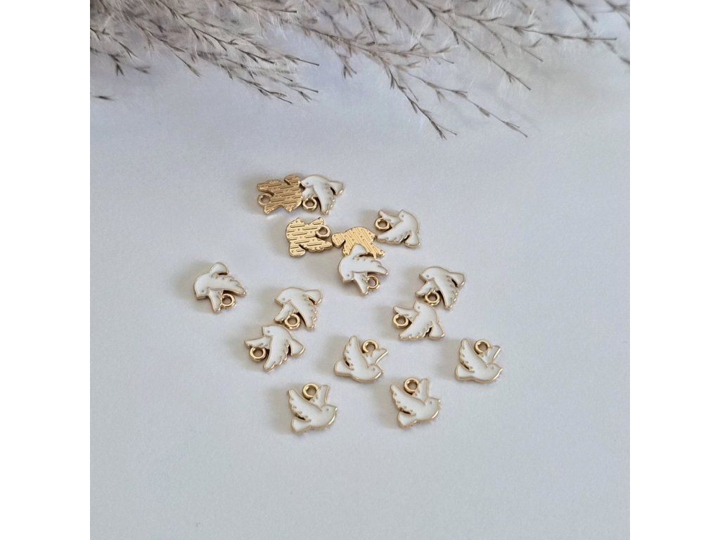 Jemný kovový přívěsek ve tvaru ptáčka v elegantním zlatém provedení doplněný o bílý smalt. Minimalistický a něžný design působí lehce a hravě, což z něj činí ideální komponent pro tvorbu originálních šperků.
