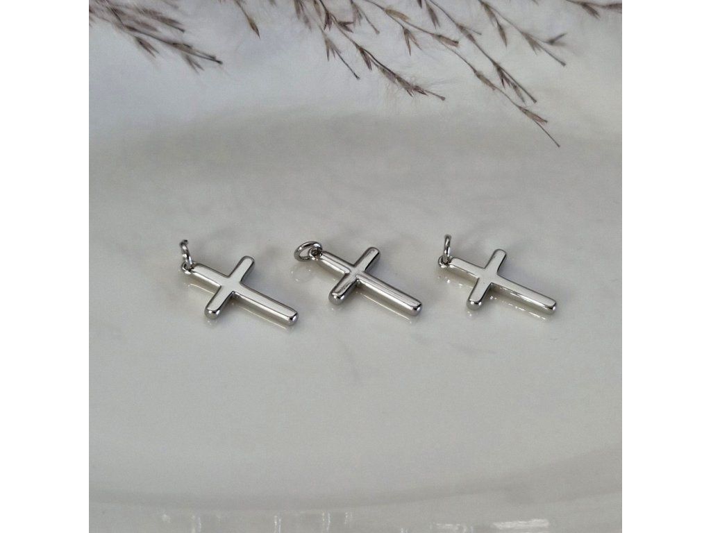 Elegantní kovový přívěsek ve tvaru křížku v lesklém stříbrném provedení. Minimalistický design působí čistě a nadčasově, díky čemuž je ideální pro tvorbu jemných i výraznějších šperků.