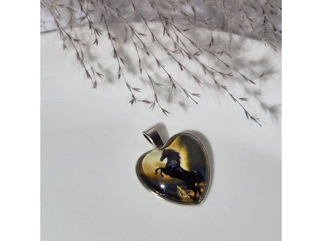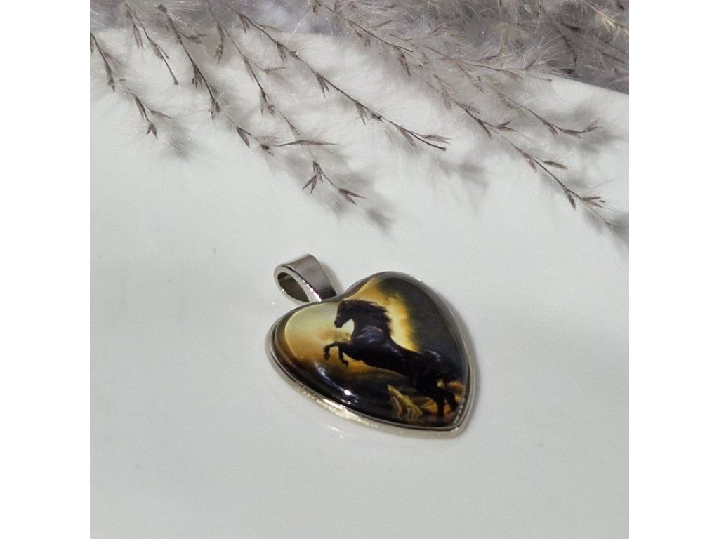 Stylový přívěsek ve tvaru srdce s motivem koně, který je ideální pro všechny milovníky koní a originálních šperků. Motiv černého koně v dramatickém světle vytváří výrazný a elegantní vzhled.