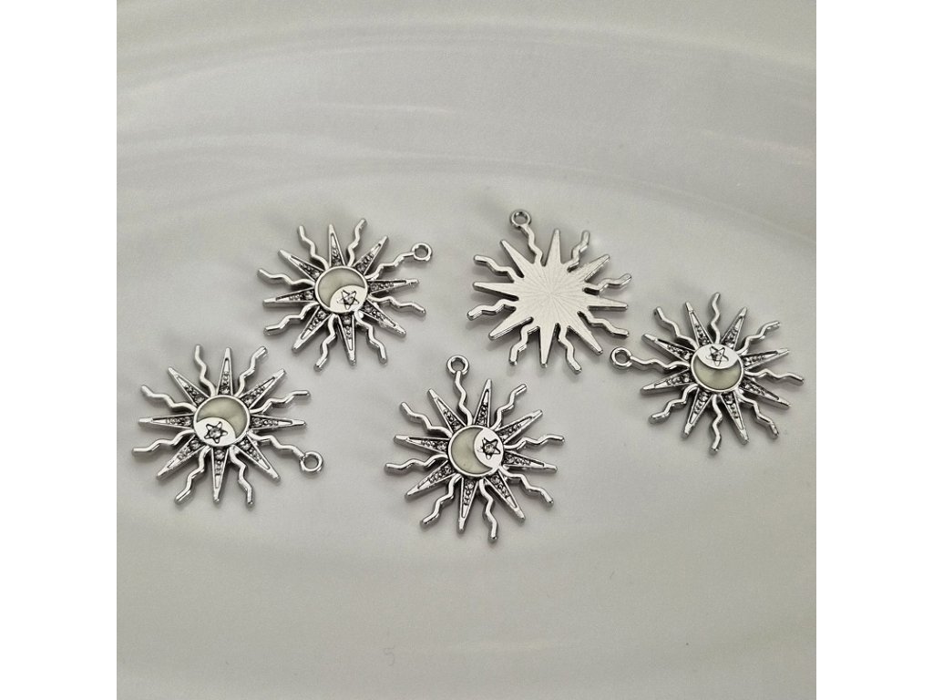 Originální kovový přívěsek ve tvaru slunce s motivem měsíce a hvězdy je výrazným a elegantním doplňkem pro tvorbu šperků i dekorací. Detailně propracovaný design s jemnými reliéfy a vsazenými kamínky dodává přívěsku luxusní vzhled.