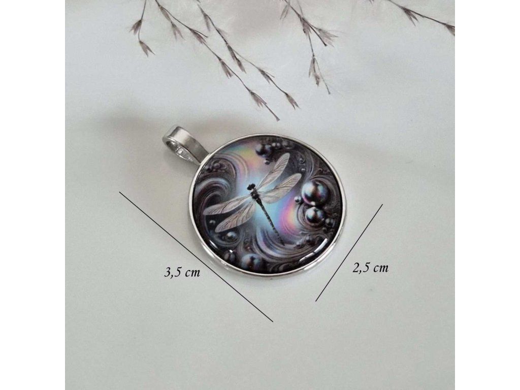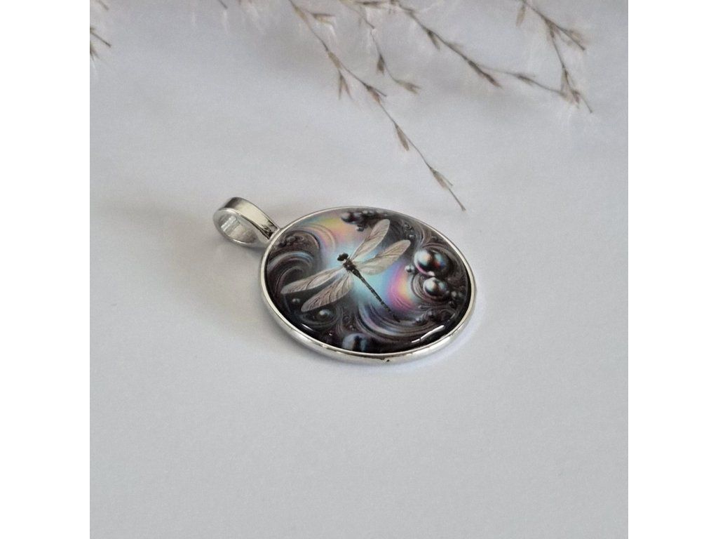 Elegantní kovový přívěsek s motivem vážky, který zaujme svým jemným a detailním designem. Motiv je chráněn skleněnou čočkou, díky které má přívěsek krásný lesk a hloubku barev.