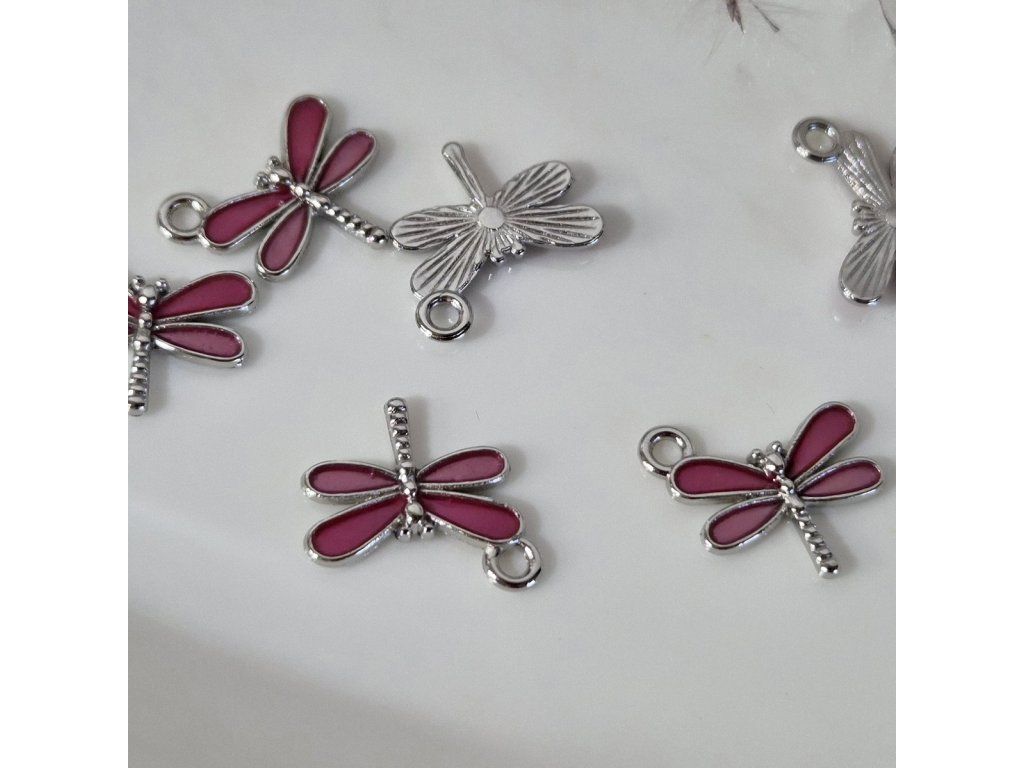 Jemný kovový přívěsek ve tvaru vážky doplněný o elegantní růžový smalt. Detailní zpracování křídel v kombinaci se stříbrným kovem a svěží růžovou barvou vytváří něžný a stylový doplněk vhodný pro výrobu originálních šperků.
