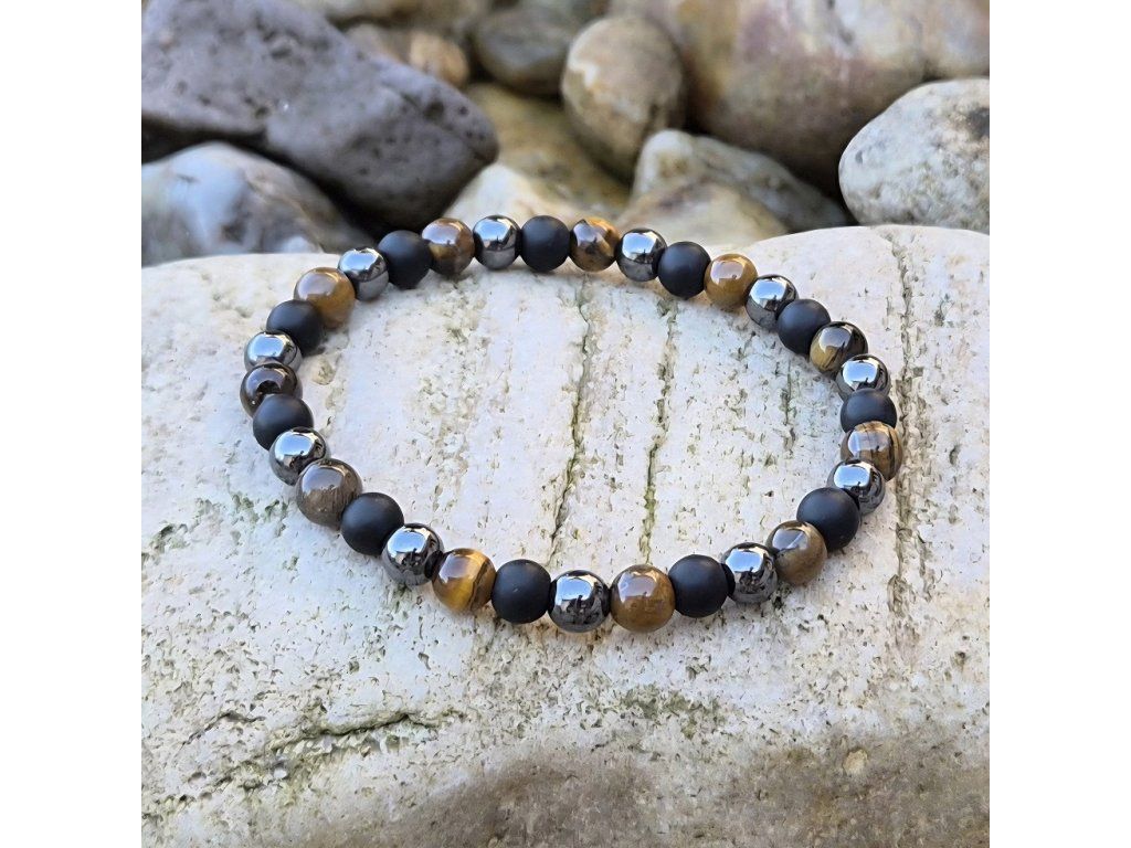Tento náramek spojuje přírodní energii achátu a tygřího oka s moderním kovovým akcentem hematitu do harmonického a stylového doplňku.