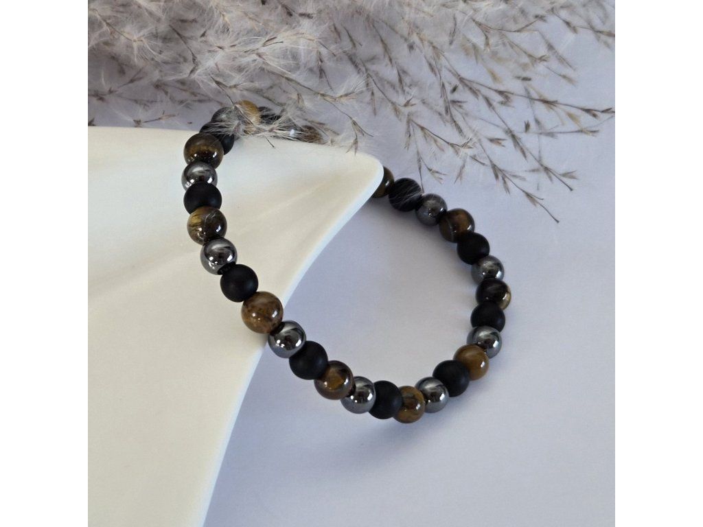 Stylový minerální náramek v kombinaci matné černé, teplých hnědých tónů a kovově stříbrného lesku. Jemnější korálky o velikosti 6 mm působí elegantně a decentně, zároveň však vytvářejí výrazný a harmonický celek.