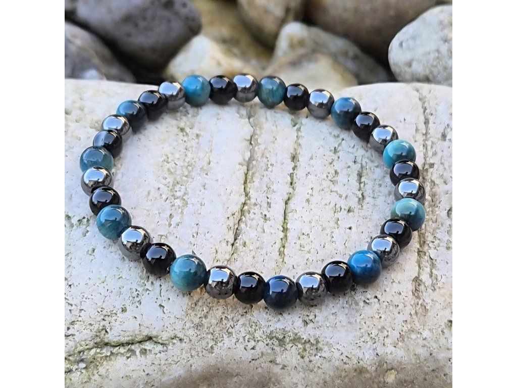 Náramek z černého onyxu, modrého Galaxy tygřího oka a hematitu – 6 mm