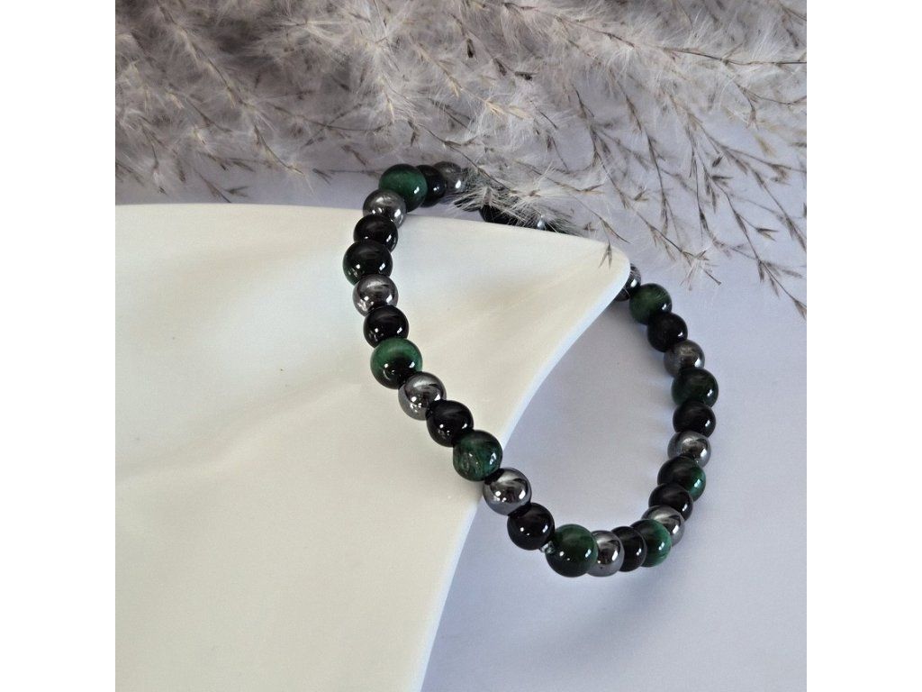 Elegantní minerální náramek v kombinaci hluboké černé, svěží zelené a kovově stříbrného lesku. Harmonické střídání lesklého onyxu, zeleného tygřího oka a stříbrného hematitu vytváří moderní a vyvážený design vhodný pro každodenní nošení.