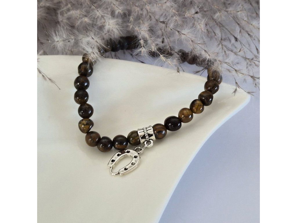 Stylový minerální náramek z hnědého tygřího oka doplněný kovovým prvkem a přívěskem ve tvaru podkovy ve stříbrném tónu. Nadčasová kombinace teplých hnědých odstínů a symbolu štěstí vytváří elegantní a výrazný doplněk.