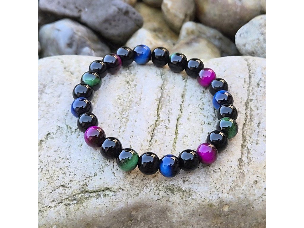 Tento náramek propojuje nadčasovou eleganci černého kamene s hravou energií barevného tygřího oka a vytváří stylový doplněk pro každou příležitost.